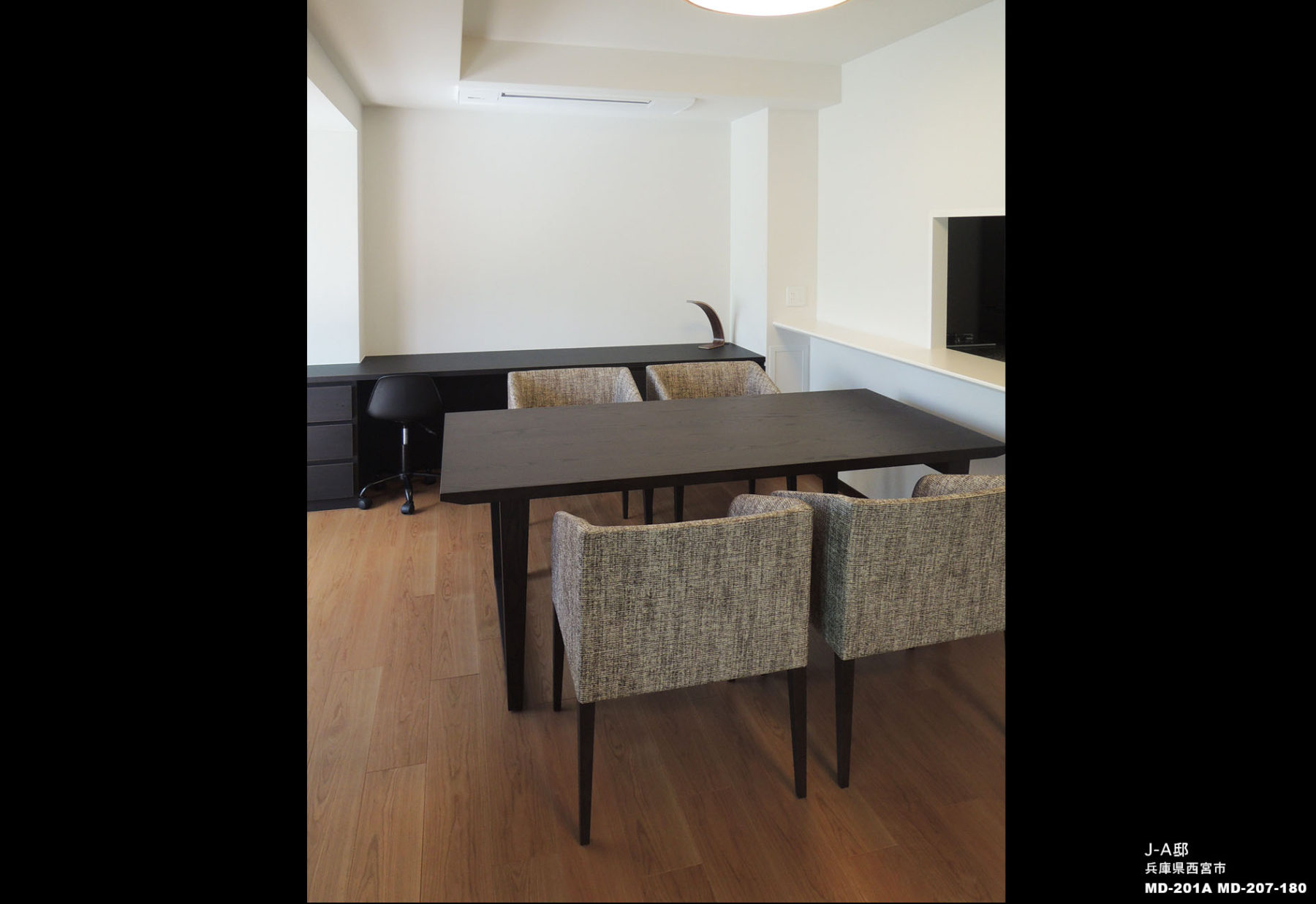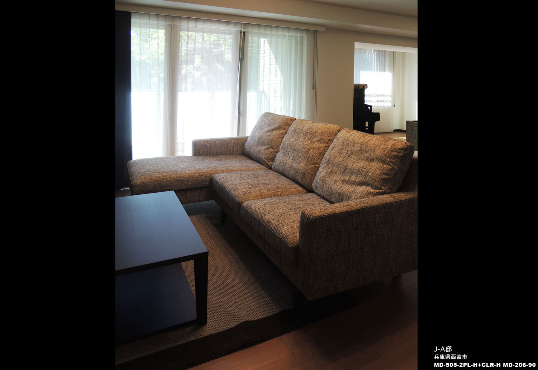 施主からの「モデルルームの様な落ち着いた空間」というご要望に対して、造作も含めて家具は重厚感のある素材でまとめました。ショールームで実際に体感して選んだソファの、ゆったりとくつろげる心地よさに大変ご満足いただいています。