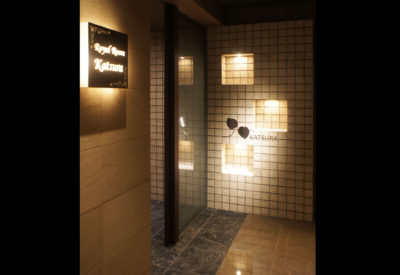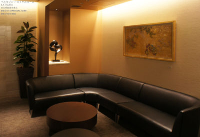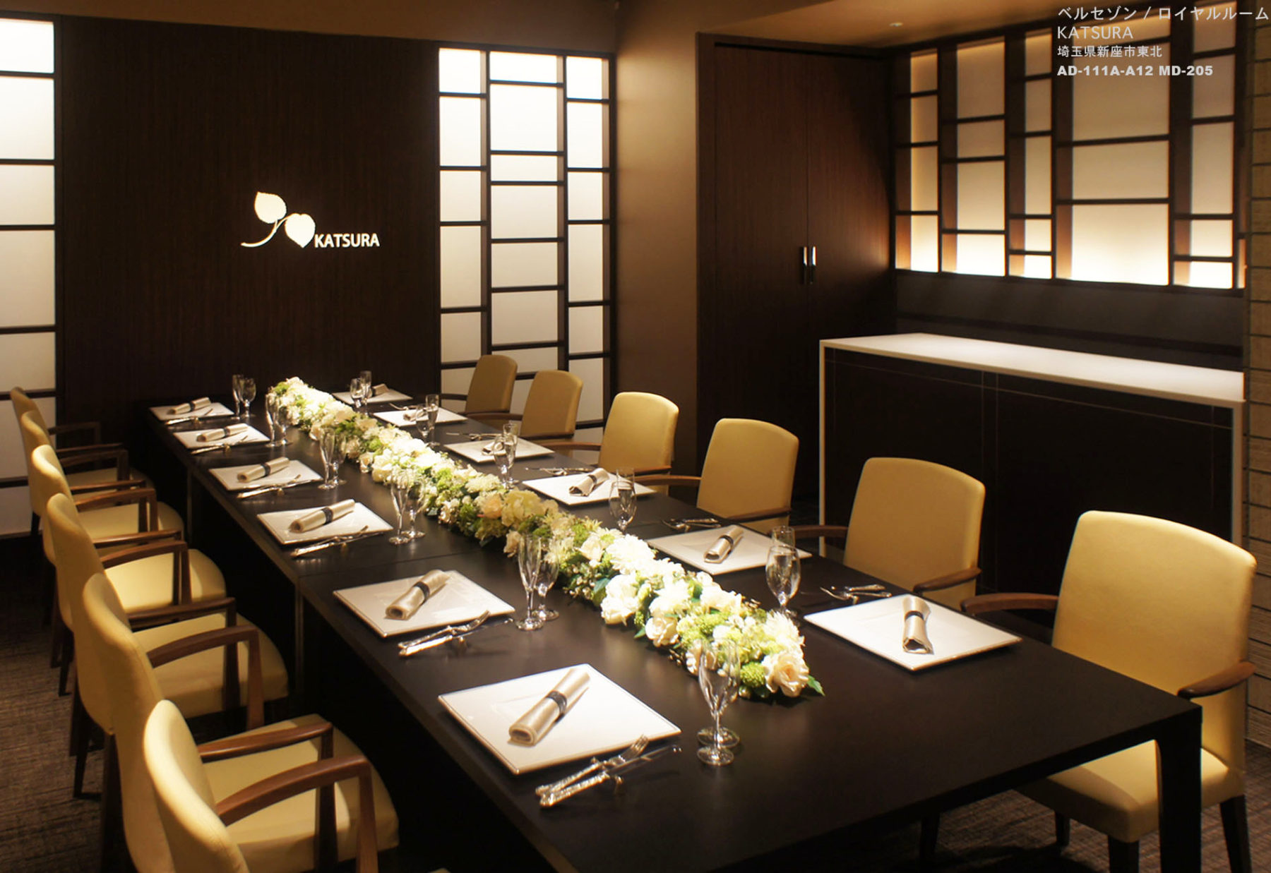 ブライダル施設ベルセゾンの中にあるロイヤルルームKATSURAは「少人数でフォーマルからカジュアルな会食まで幅広く利用できる空間」というコンセプトのもとリニューアルされました。54㎡ほどの小スペースですが、他のバンケットルームにはない和と洋のテイストが混在した、重厚で落ち着きのあるしつらえで、バーカウンターやレストエリアを持つプライベートルームです。