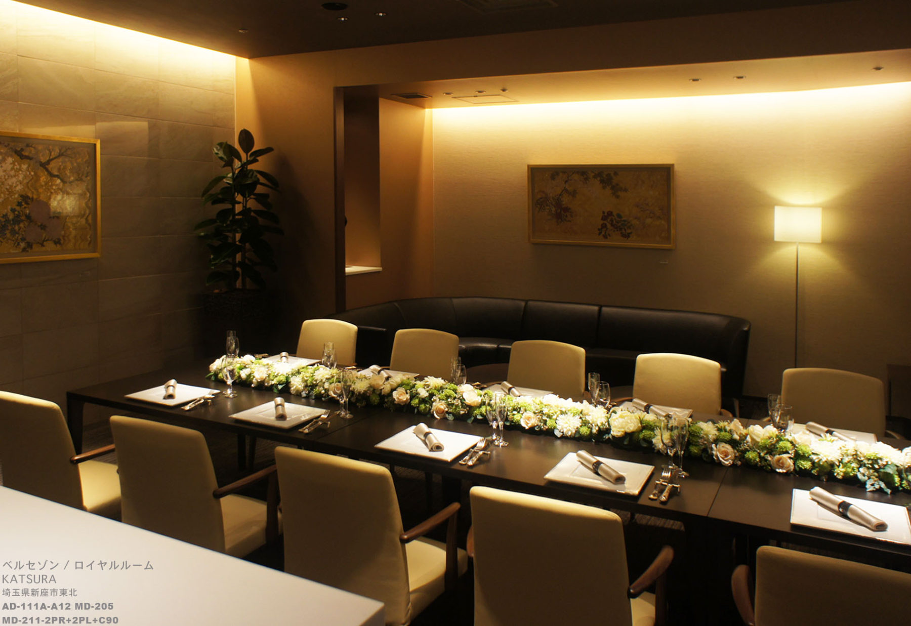 ベルセゾン(=美しい四季)の名前に因んだ四季の花々をイメージした日本画も、その箔画が柔らかい間接照明に溶け込み、特別な会食のひとときに花を添えています。