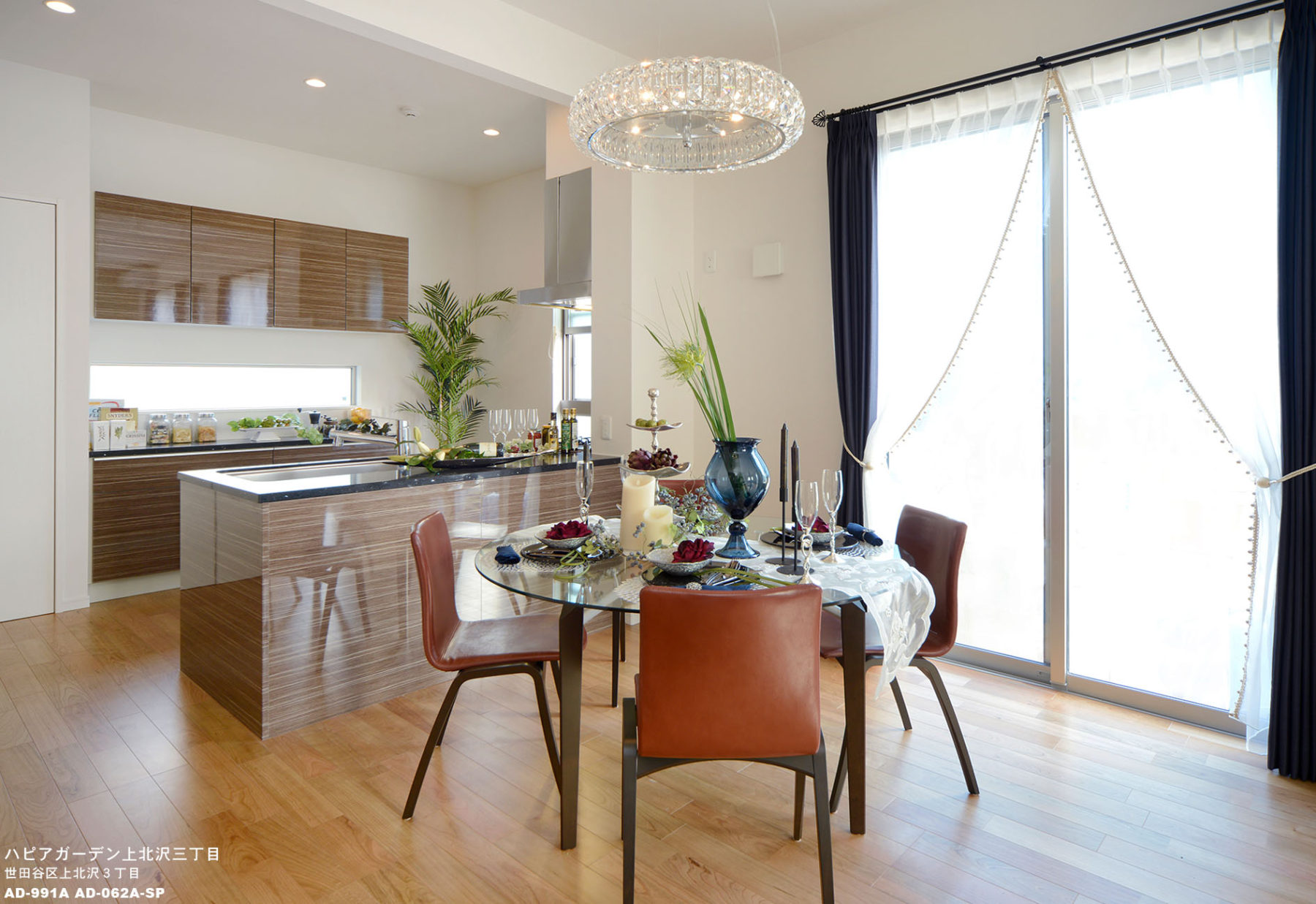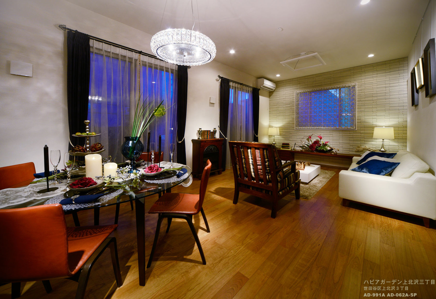 高い天井、壁面タイル等の建築ディテールからも、落ち着きのあるラグジュアリー感の感じられる物件なので、カーテン・照明・家具・小物においても落ち着きのある華やかさを演出しました。アイテムには、石・ガラス・木・革と、異素材をミックスして配し、シックな空間の中にもキラメキが感じられる、アクセントを効かせたインテリアにまとめました。