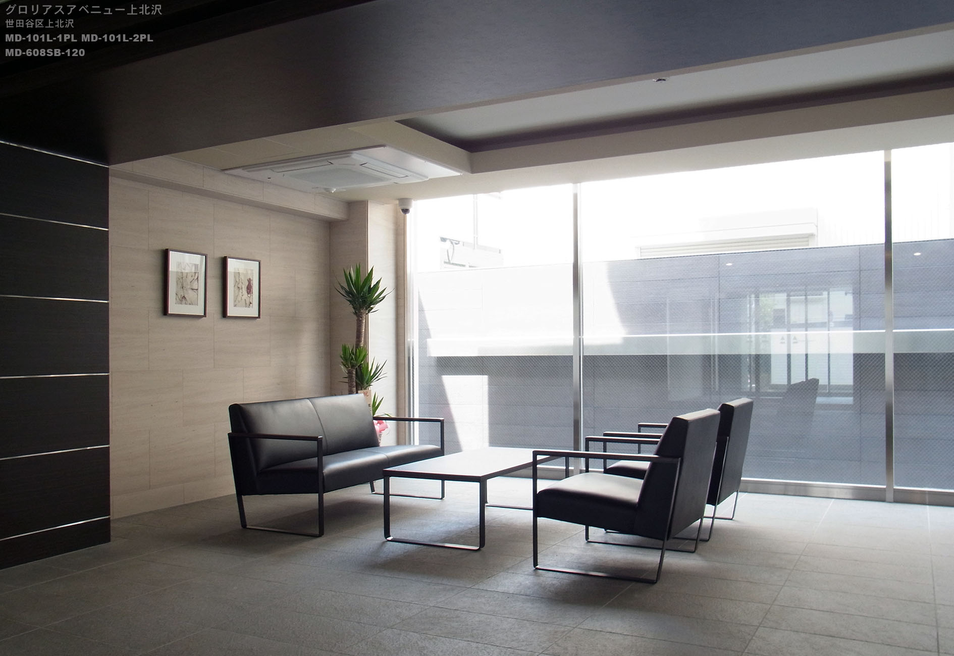 納入後の感想:エントランスの天然石貼りの静かな空間に、黒いスチールフレームがとてもマッチしています。
