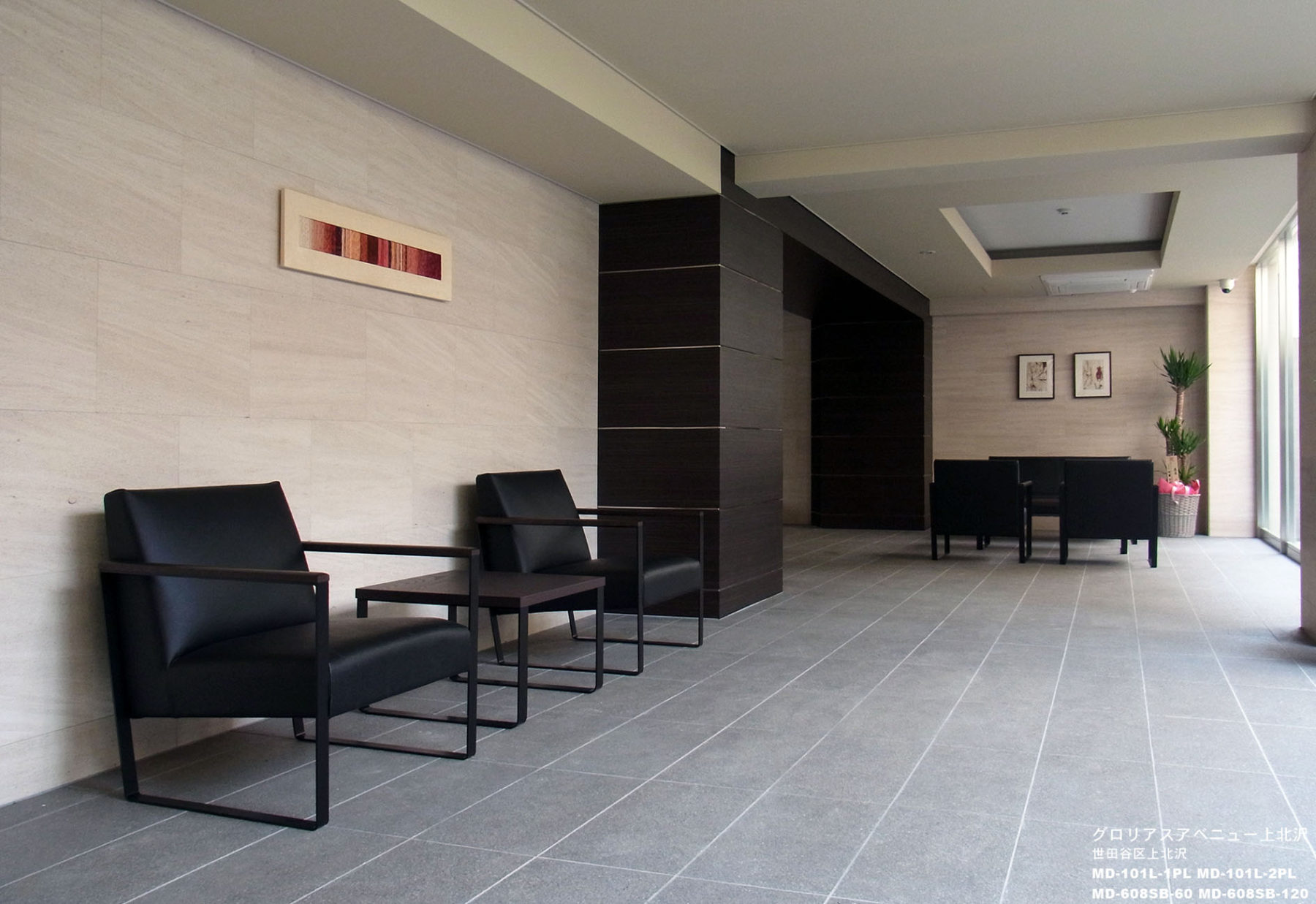 納入後の感想:エントランスの天然石貼りの静かな空間に、黒いスチールフレームがとてもマッチしています。