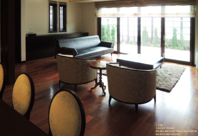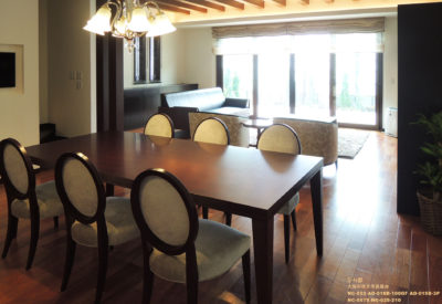 木造の構造を活かした梁を出し、高い天井と大きな窓から外へ続く開放的なプランです。インテリアは、花梨の床と壁面の石のアクセントで重厚感を出しました。その重厚感のある空間に、間接照明やポイントとなるシャンデリアを提案し、クラシックすぎない現代的なクラシックを目指しました。こだわったインテリアに合うように、テレビボードやサイドボードも特注でエーディコア・ディバイズに製作を依頼しました。