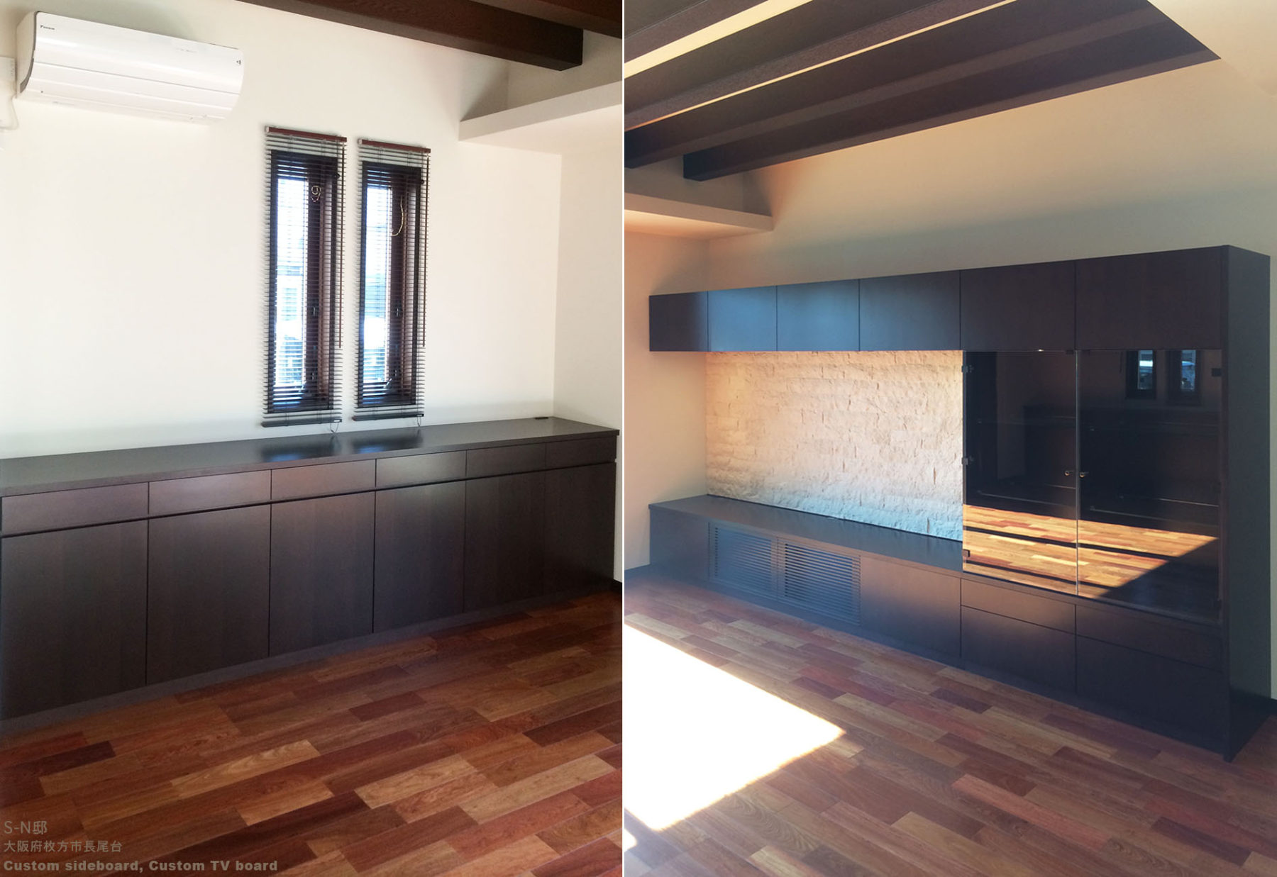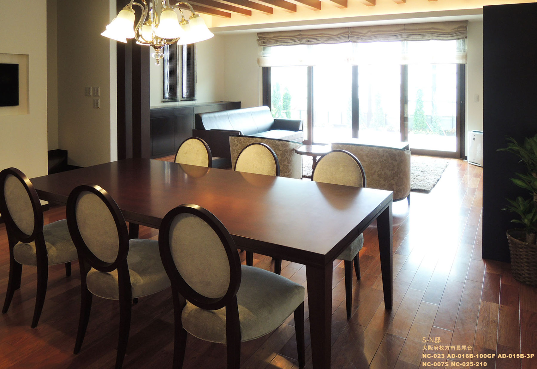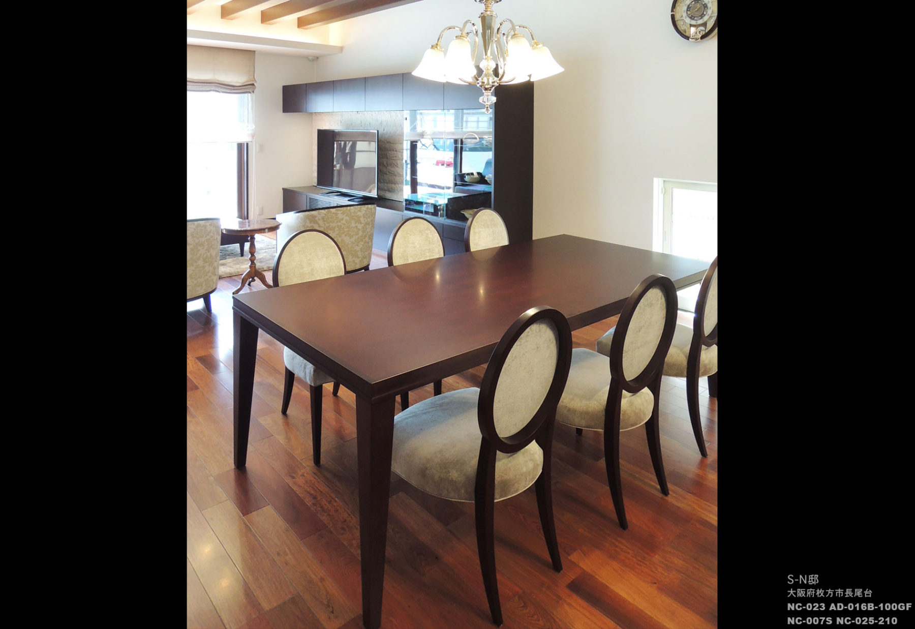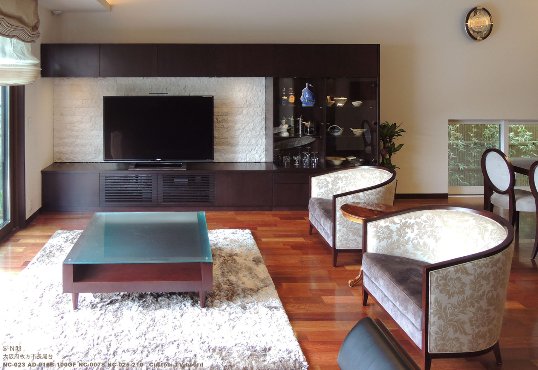 木造の構造を活かした梁を出し、高い天井と大きな窓から外へ続く開放的なプランです。インテリアは、花梨の床と壁面の石のアクセントで重厚感を出しました。その重厚感のある空間に、間接照明やポイントとなるシャンデリアを提案し、クラシックすぎない現代的なクラシックを目指しました。こだわったインテリアに合うように、テレビボードやサイドボードも特注でエーディコア・ディバイズに製作を依頼しました。