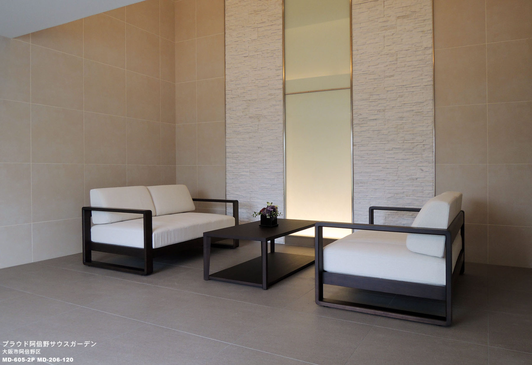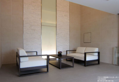大阪市阿倍野区住宅街の学校に隣接した住宅街。街並みに映えるひときわのゆとりと個性を主張する、洗練の邸。プラウド阿倍野サウスガーデン。光と緑を感じるのびやかなエントランスホールがしつらえられています。木立が見渡せる大きな窓の横に配置したラウンジチェアは 明るい色調のコーディネートに上質な印象を添えてくれます。