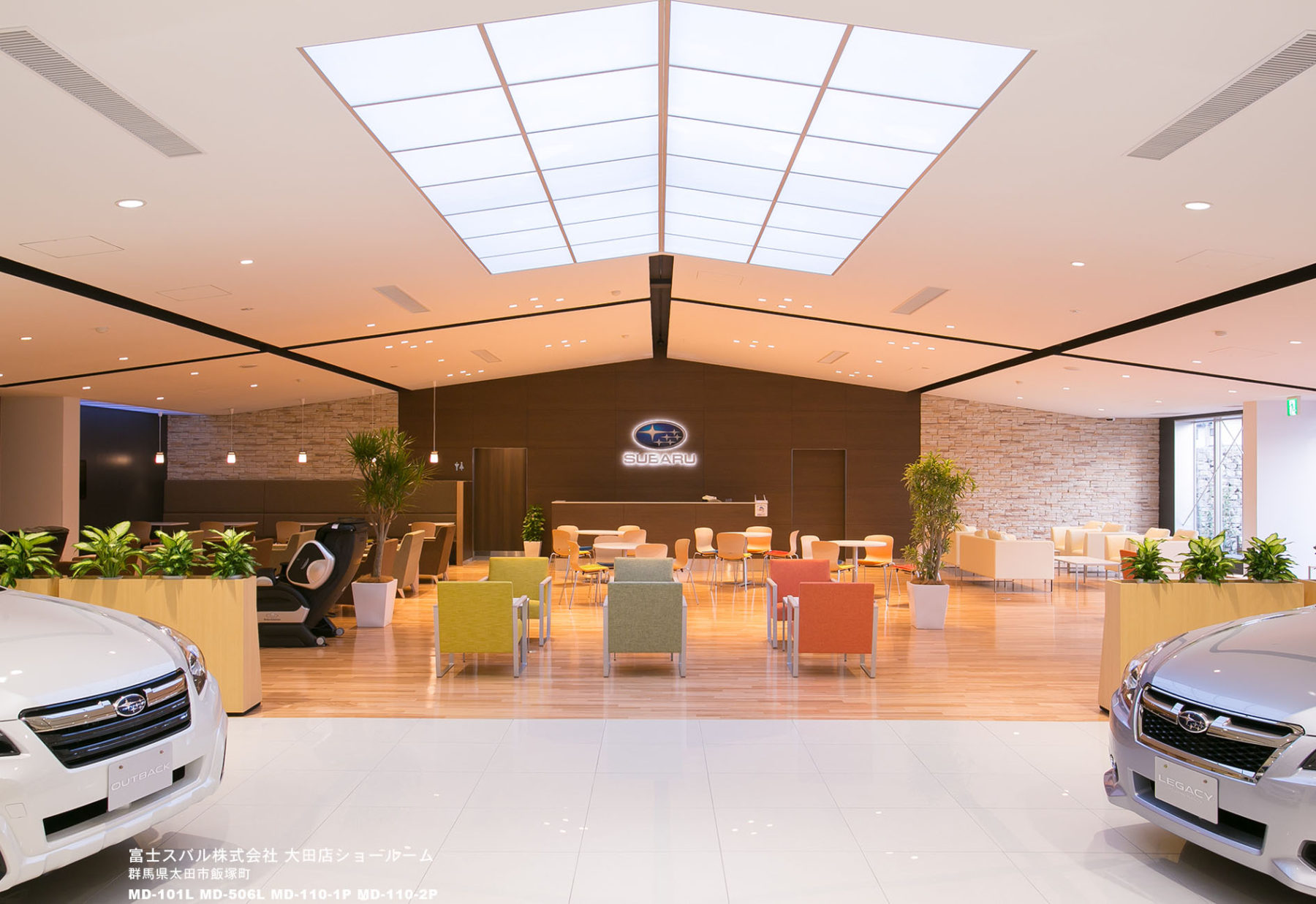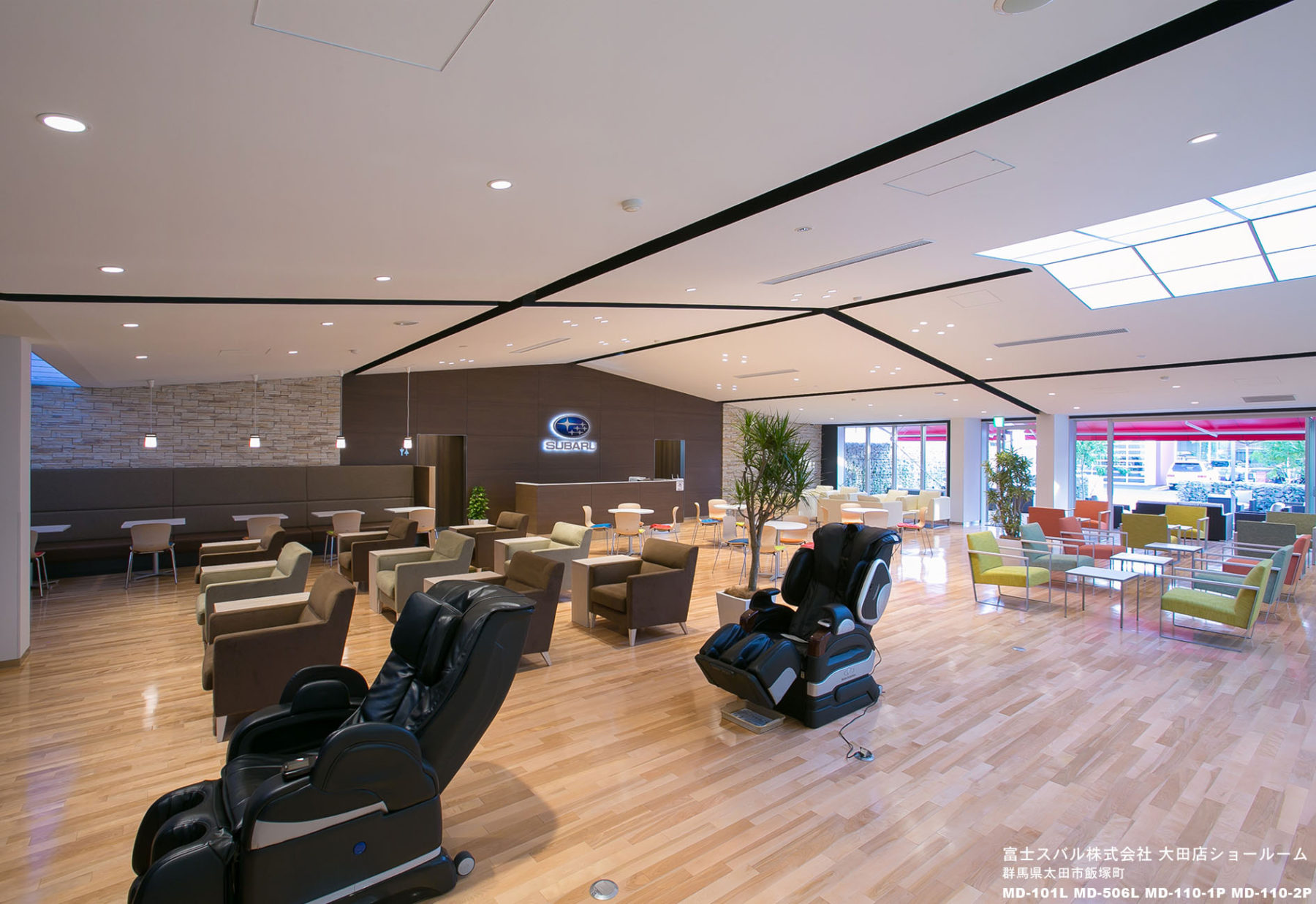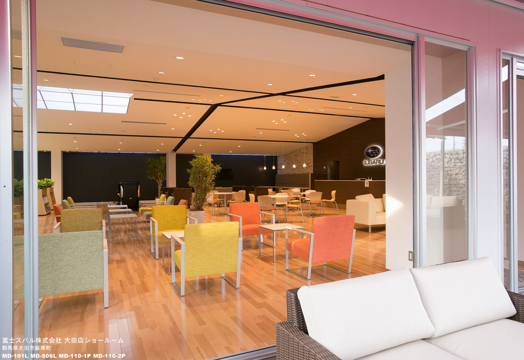 リニューアルオープンした太田店は、スバル発祥の地であり、現在もスバル車の製造工場がある群馬県太田市に構えています。その為、ユーザーはもとより国内外から視察にも訪れる日本最大級のショールームです。スバル車が全車種展示されているショールーム内は広く、そのスケール感に圧倒されます。そんな中、カフェラウンジのソファにやさしい色彩を取り入れることによって、リラックスできる雰囲気づくりを主眼としました。
