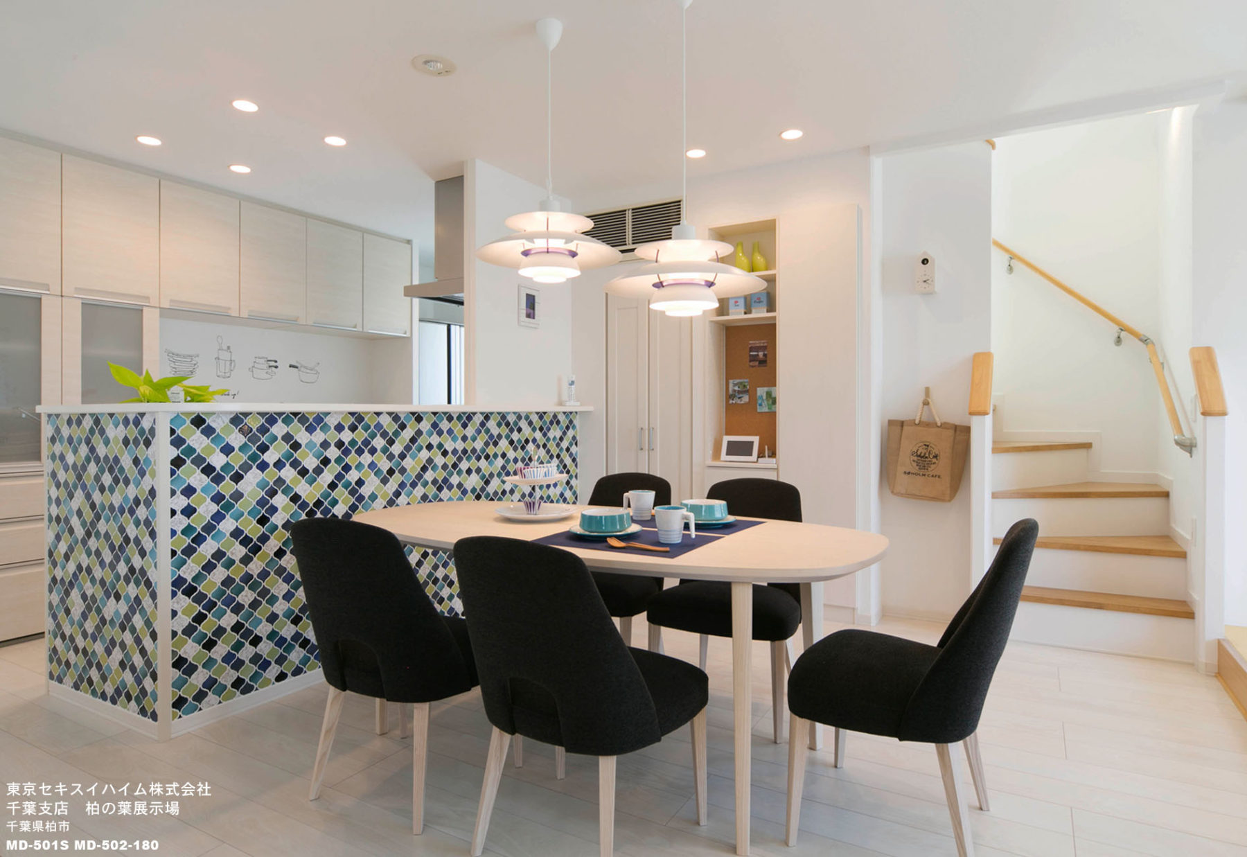 当社製品の採用理由:ホワイトを基調に、アクセントでブルー、グリーンを使用した北欧テイストの若い世帯の空間に、丸みのある少しカジュアルなデザインがぴったりでした。