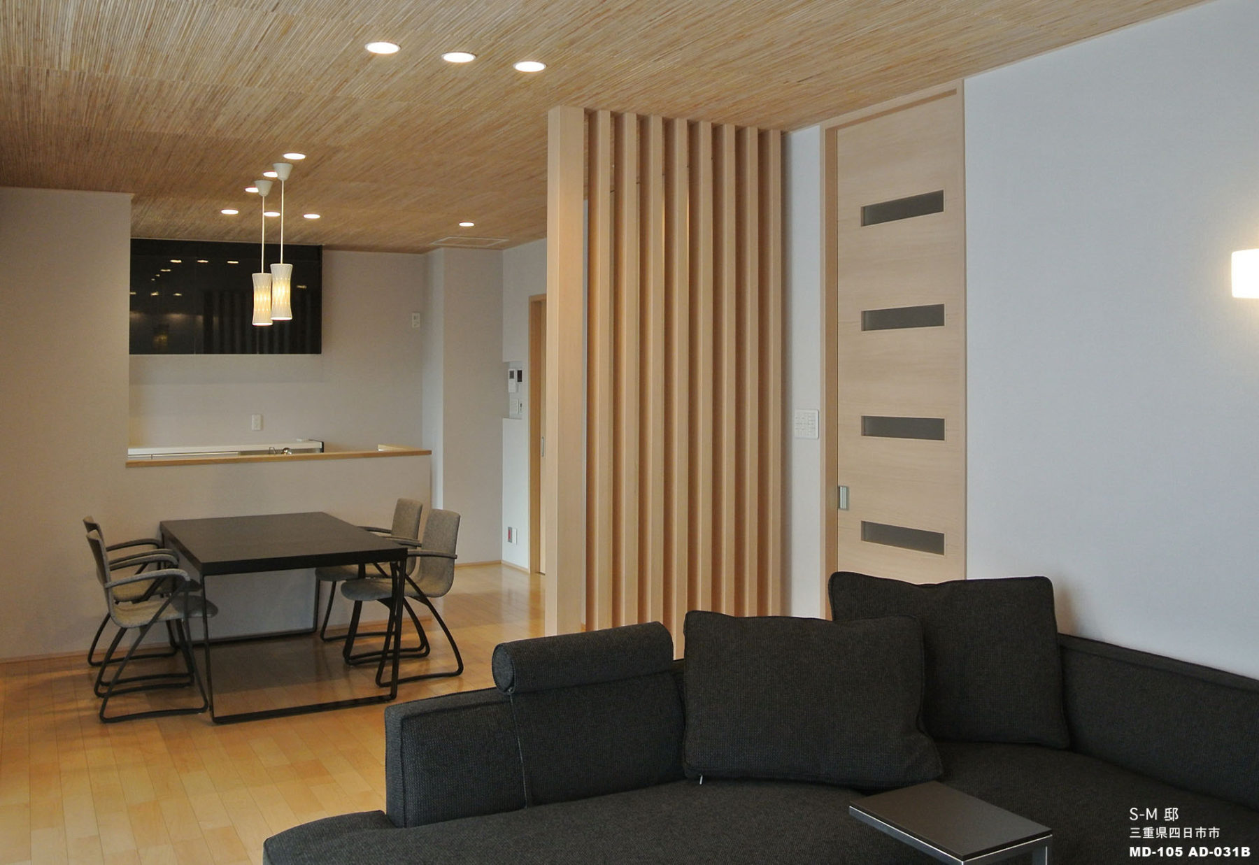 インテリアは和モダンをご希望のお施主様のために、LDKの天井には、葭を使用して雰囲気を出し、またウィンドウトリートメントは障子を使うなど統一感を出しています。