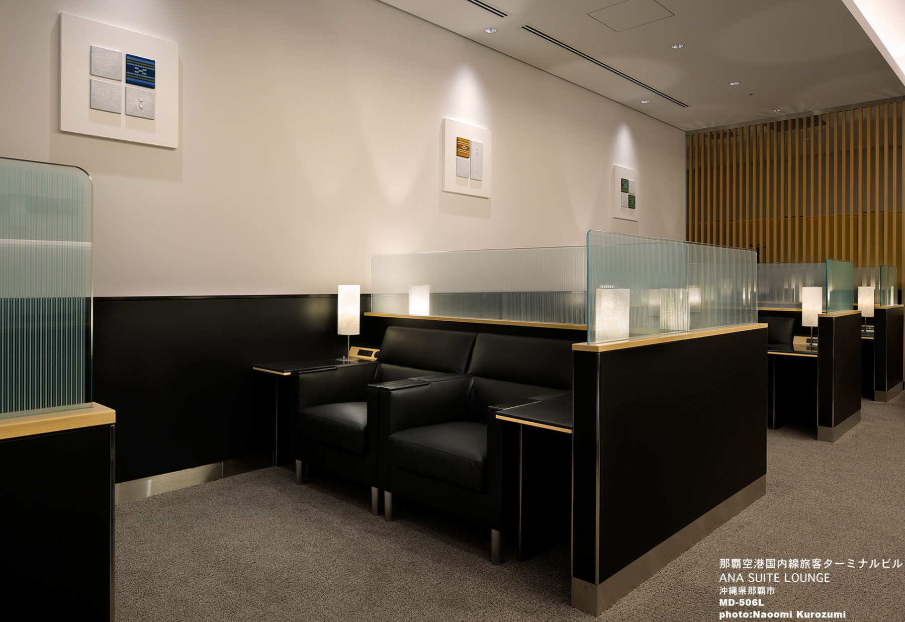 ANAブランドの安心感を継承するLEDによるブルーラインや縦格子のキーアイコンとともに、外光の入らない空間特質を活かした落ち着きのある家具、仕上げのテクスチャア、色彩計画により上質で豊かなリラックススペースを作り上げました。緊張感のある無彩色の組み合わせに木質仕上げや温かみのある照明で和やかさを演出し、モダンさと落ち着きある空間を実現しました。