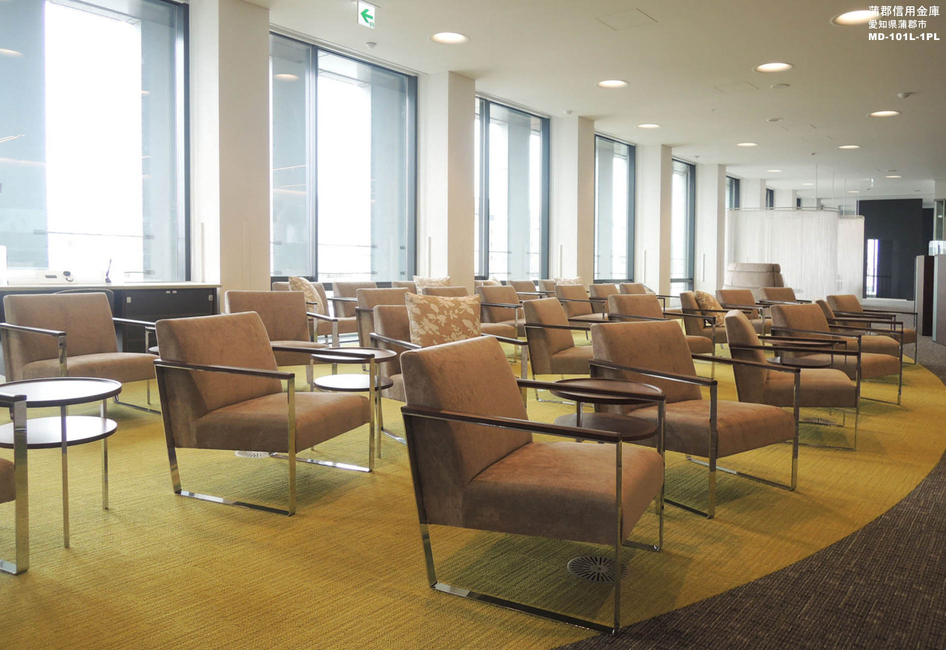銀行の本店らしく重厚感を持ちつつも温かみのある雰囲気でお客様をお迎えします。一人一人のお客様を大切に、様々なシーンに対応した設えと待合スタイルを用意し、個別のゆったりとしたアームチェアで心地よいリラックスした空間を目指しました。