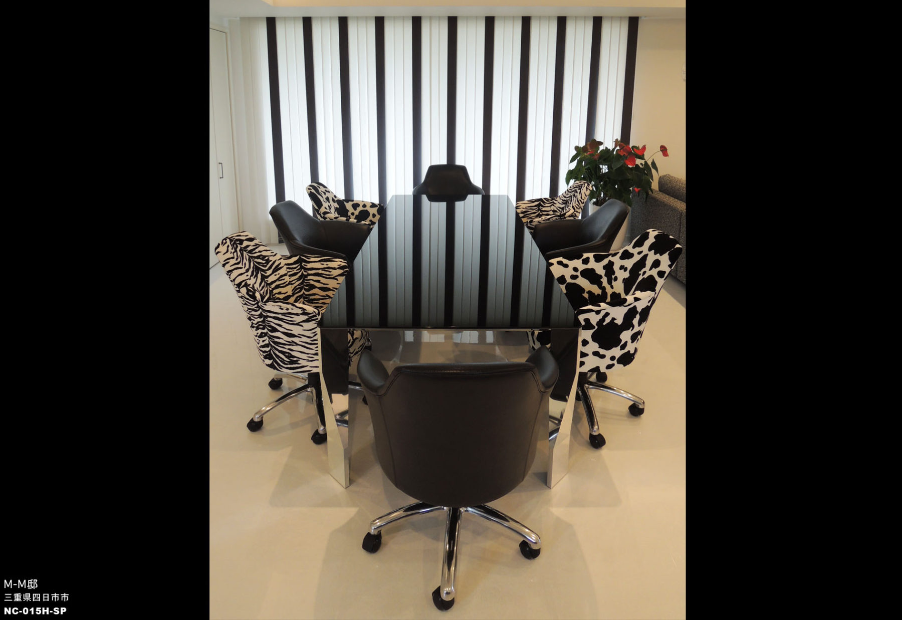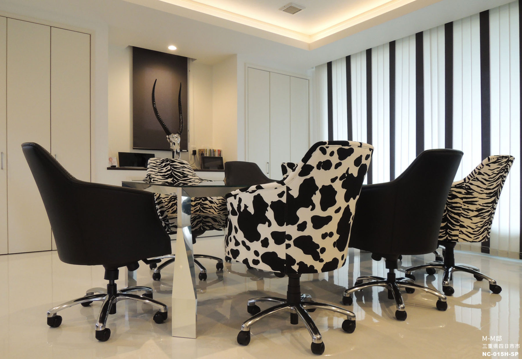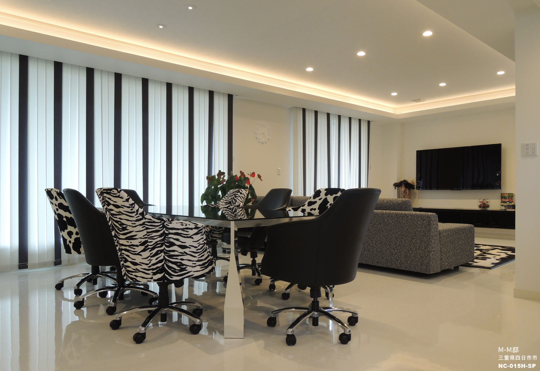 白を基調としたモダンでシンプルな空間に、黒い家具やゼブラやハラコでアクセントを付けて大人の空間し仕上げました。