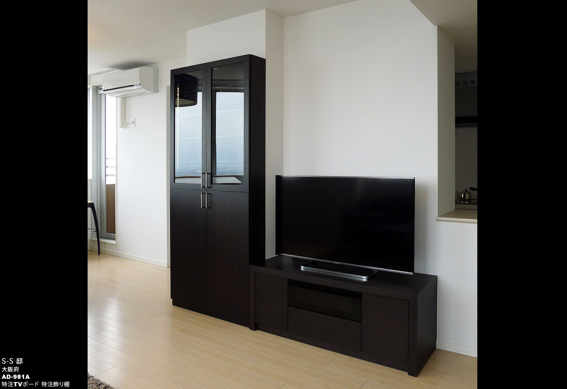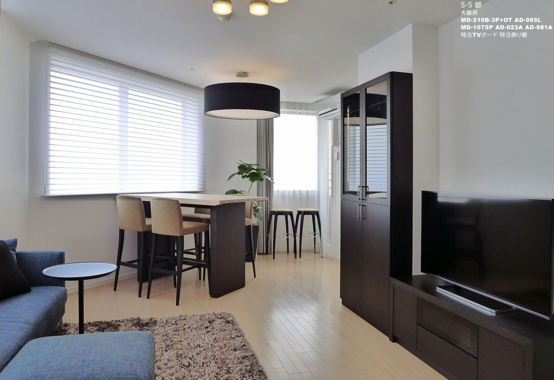 納入後の感想:ソファには、シックなブルーの張地を特別にオーダーさせて頂きましたが、周囲の家具のダークブラウンと相性も良く、特別感のある仕上がりになりました。特注ダイニングテーブルは、窓高さにぴったり合わせて頂き、お客様からも「この部屋の為だけに作られたという感じで、とても気に入っています」と有難いお言葉も頂きました。