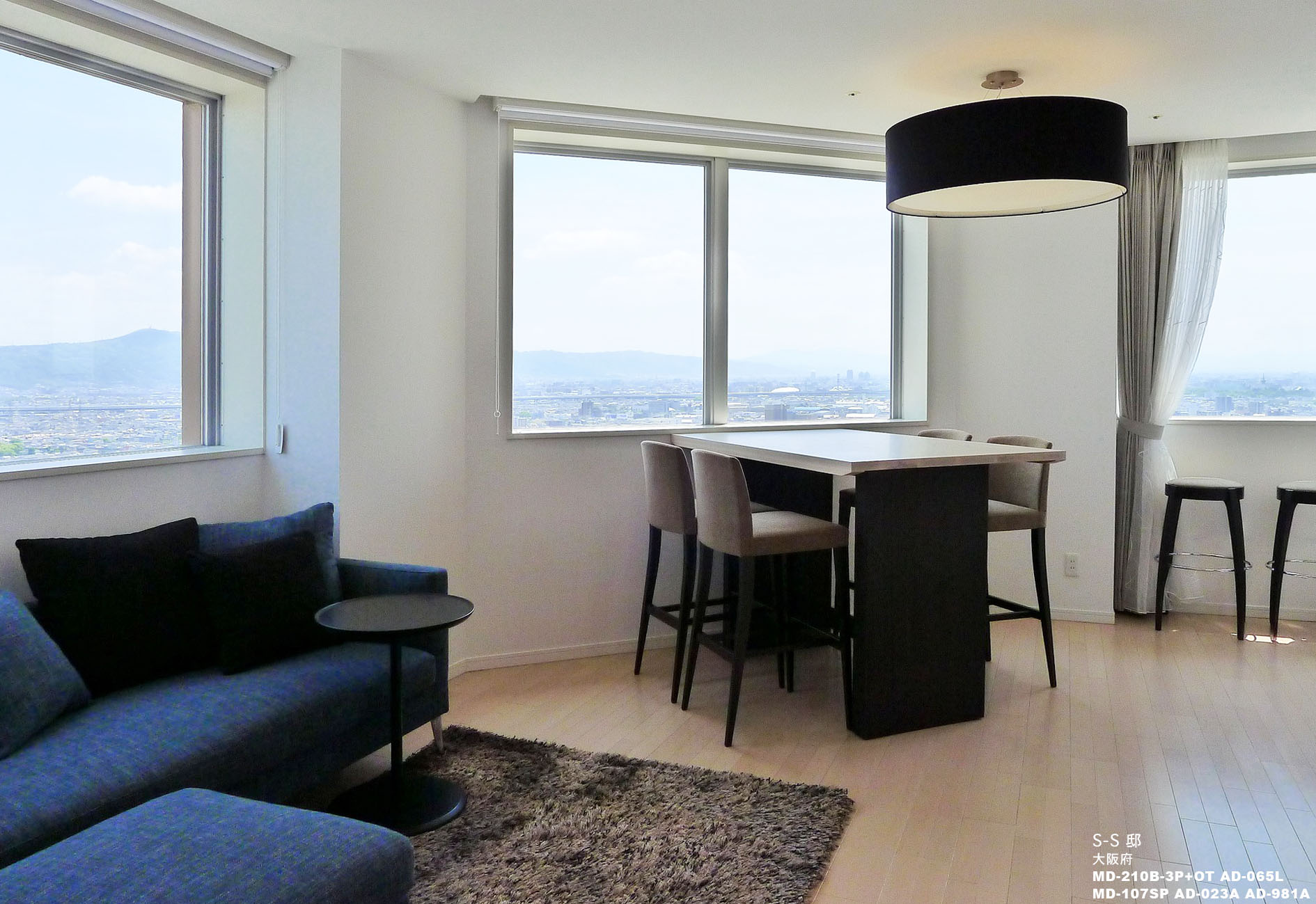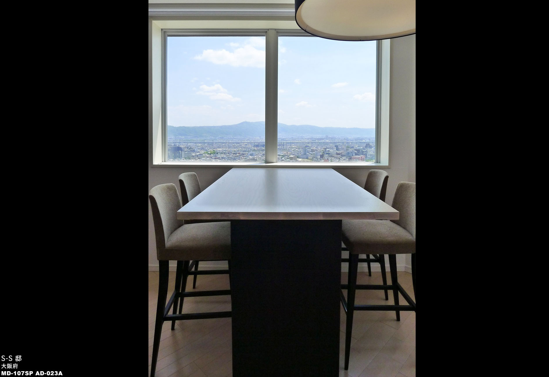 眺望の良さが魅力のお住まいでしたので、窓高さに合わせたハイタイプの特注テーブルと、あえて大きめサイズの照明をコーディネート。素晴らしい眺望を眺めながらの食卓シーンに、非日常感を演出いたしました。