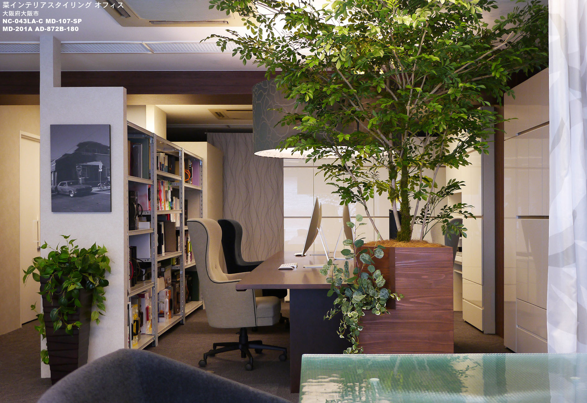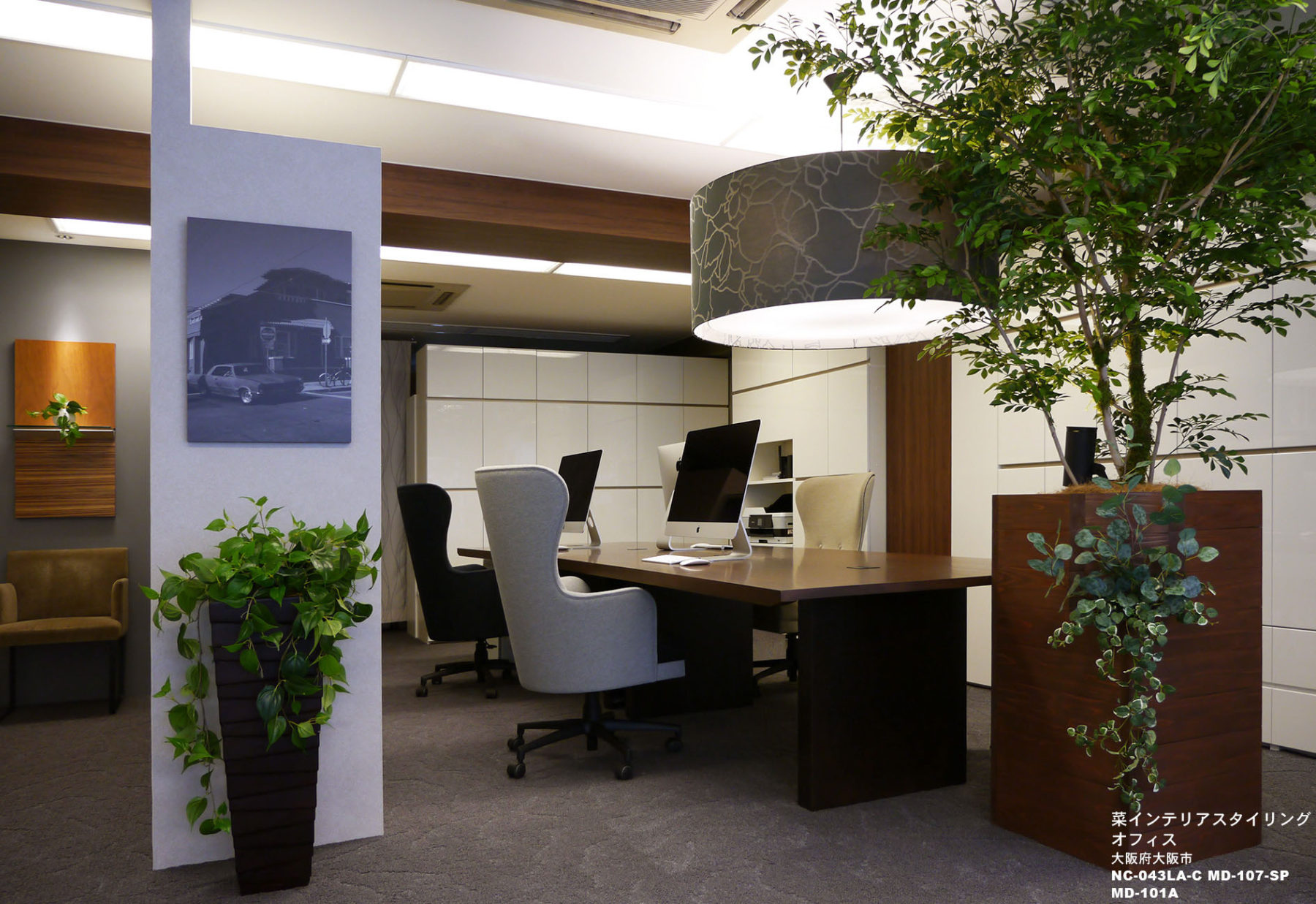 「ヴィンテージナチュラル」をテーマに、オープンスタイルのオフィスにリニューアル。 天井まで広がる特注グリーンや、直径1000㎜の特注ペンダント照明など、大胆なクロスの貼り分けに加え、印象的でダイナミックなアイテムをコーディネートしました。