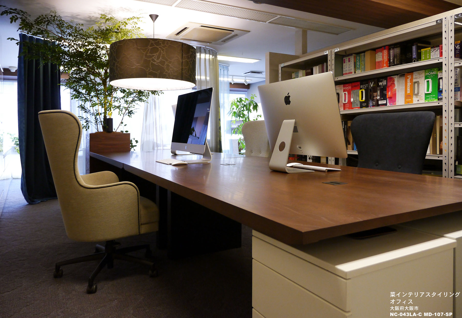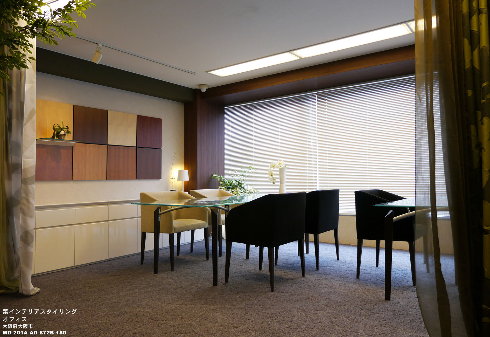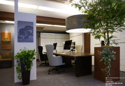 当社製品の採用理由:オープンスタイルのオフィスには、ぜひ大型の無垢テーブルを入れたいと考えました。 従来から特注品の完成度の高さを知っていましたので、規格にあるテーブルのサイズ・仕様変更という形で、オーダーしました。 また、キャスター付ウィングバックチェアも、3脚それぞれ張分けを変更するという特注をお願いしました。