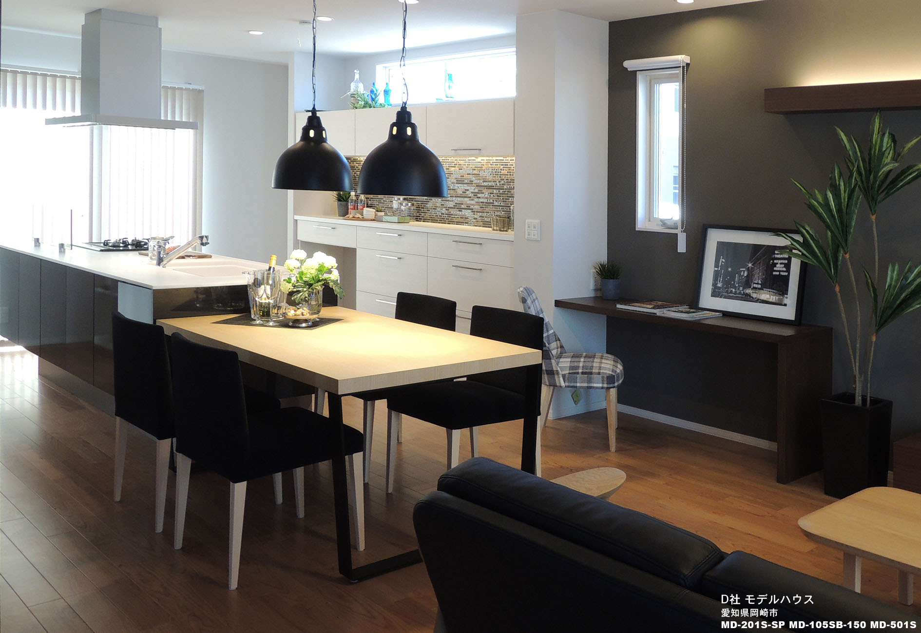 ダイニングの照明が特徴的だったので黒をアクセントカラーとし、テーブルの脚をアイアンぽく見せる事で、カフェスタイル風に仕上げました。また、優しいイメージのチェックの張地を入れる事をポイントにしました。
