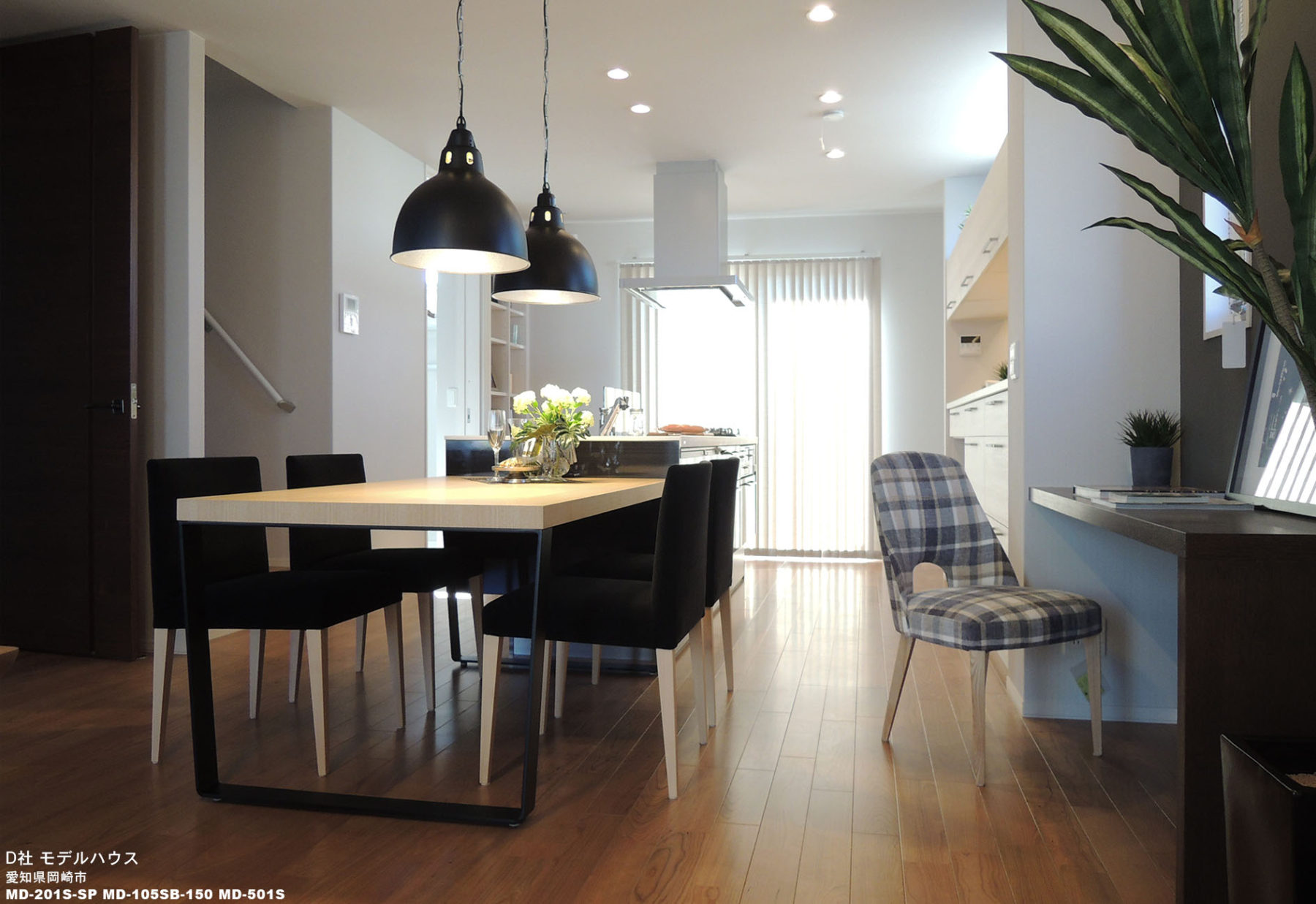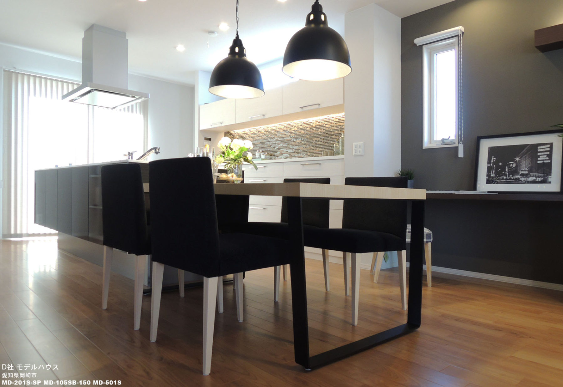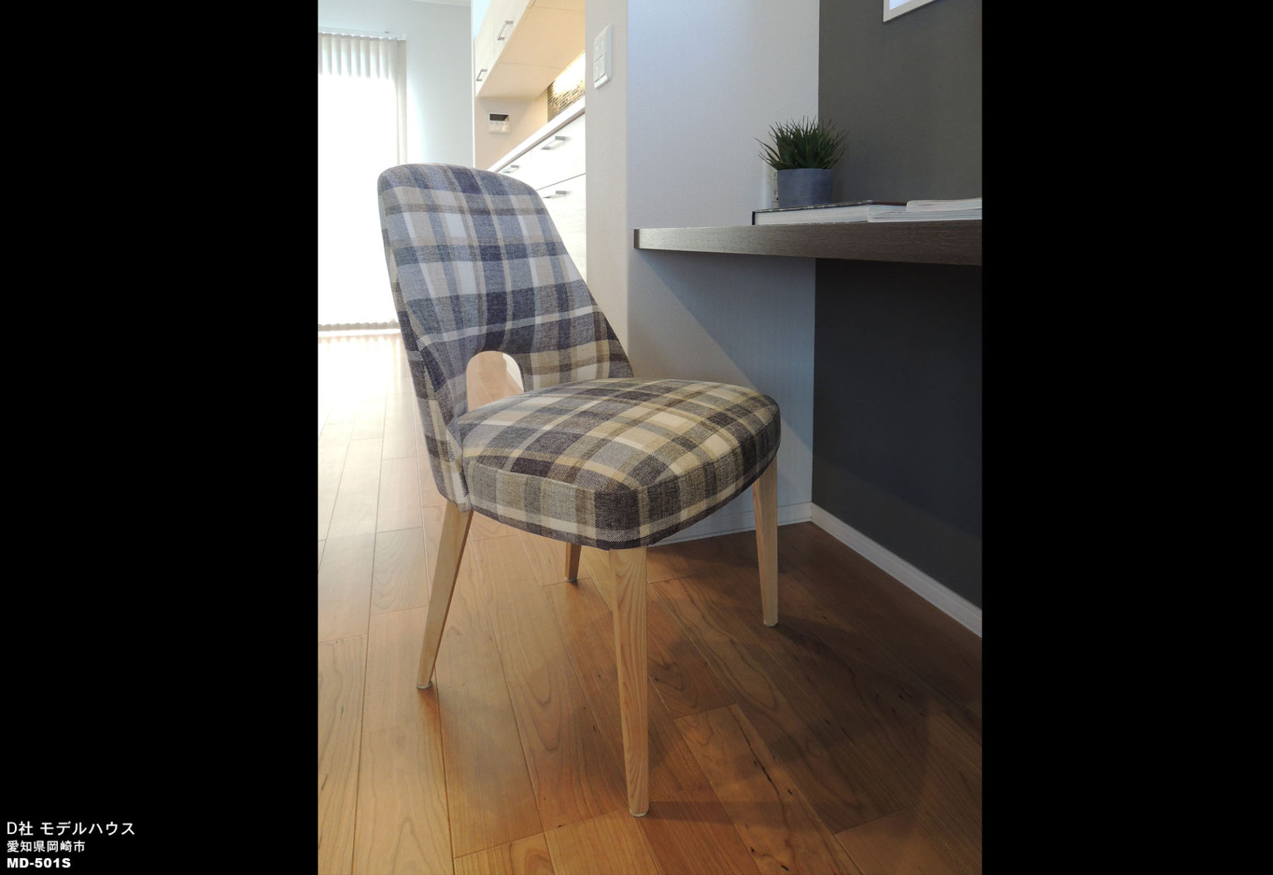 ダイニングの照明が特徴的だったので黒をアクセントカラーとし、テーブルの脚をアイアンぽく見せる事で、カフェスタイル風に仕上げました。また、優しいイメージのチェックの張地を入れる事をポイントにしました。
