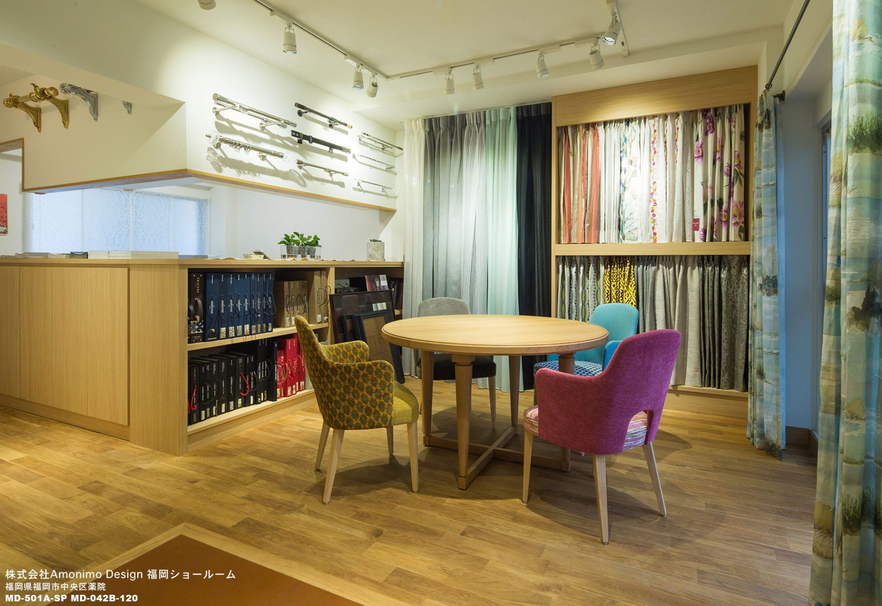 ヨーロッパ製のカーテンや椅子張り生地などのショールームなので、製品の持つ雰囲気を伝えられるように材料は無垢材などを使用するように心がけました。また、与えられた空間が限られているため、視線を遮る壁を無くして、狭いながらも解放感を感じさせる空間作りとなっています。福岡では主にフランスの生地を使用しているので、どちらかというと可愛らしい女性的な空間に仕上がったと思います。