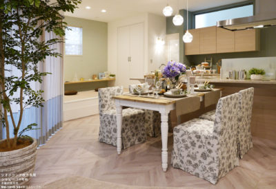 新築戸建分譲街区に完成した、3棟の異なるイメージのモデルハウスの内の一棟、「シャビー(Shabby)」~洗練された “大人かわいいスタイル”~をコンセプトにしたモデルハウスです。ヘリンボーンのグレイッシュな床・淡いブルーやパープルのソフトなカラーをアクセントに、上質感のあるフェミニンなインテリア空間にまとめました。家族の顔が見えるLDKのレイアウトに添って、家族やご友人など、女性の集いのシーンをリアルに演出しています。