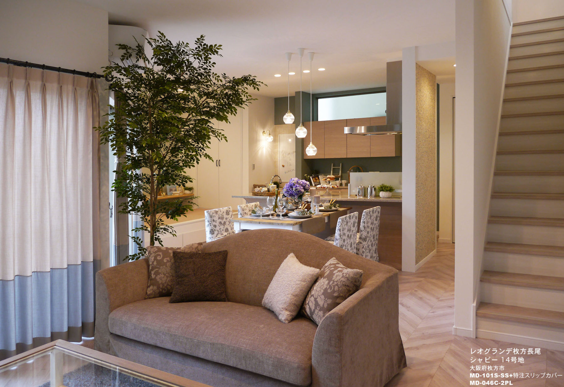 納入後の感想:ソファの柔らかく女性的なフォルムが、優しい空間イメージの象徴となりました。ダイニングチェアのスリップカバーは、スタイルからも素敵なアイテムですが、チェアのリメイク、という点で実用性もあるので今後ご提案の幅が広がると感じました。オープン後、女性に一番人気の高いモデルハウスになっていると嬉しいお言葉も頂きました。