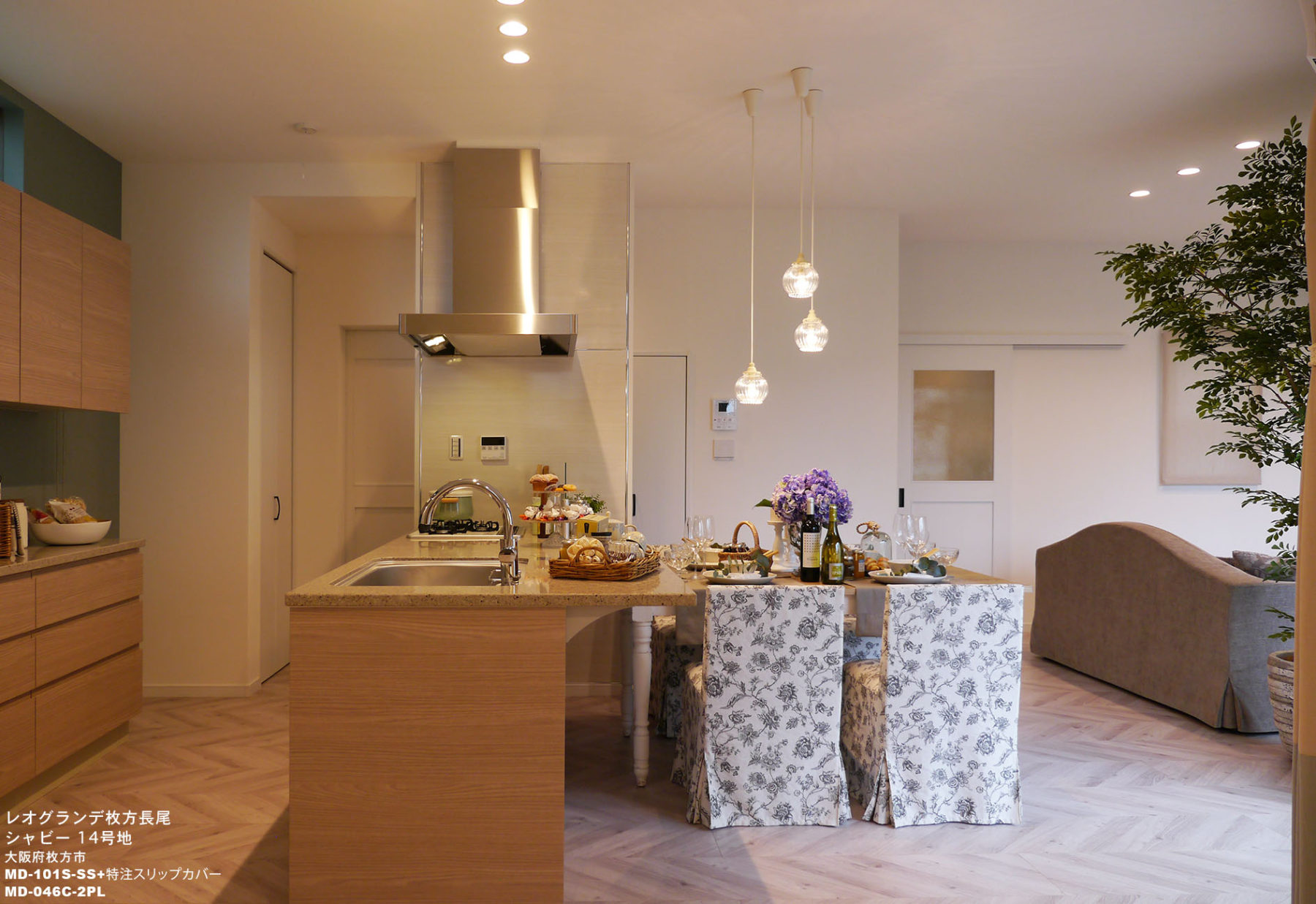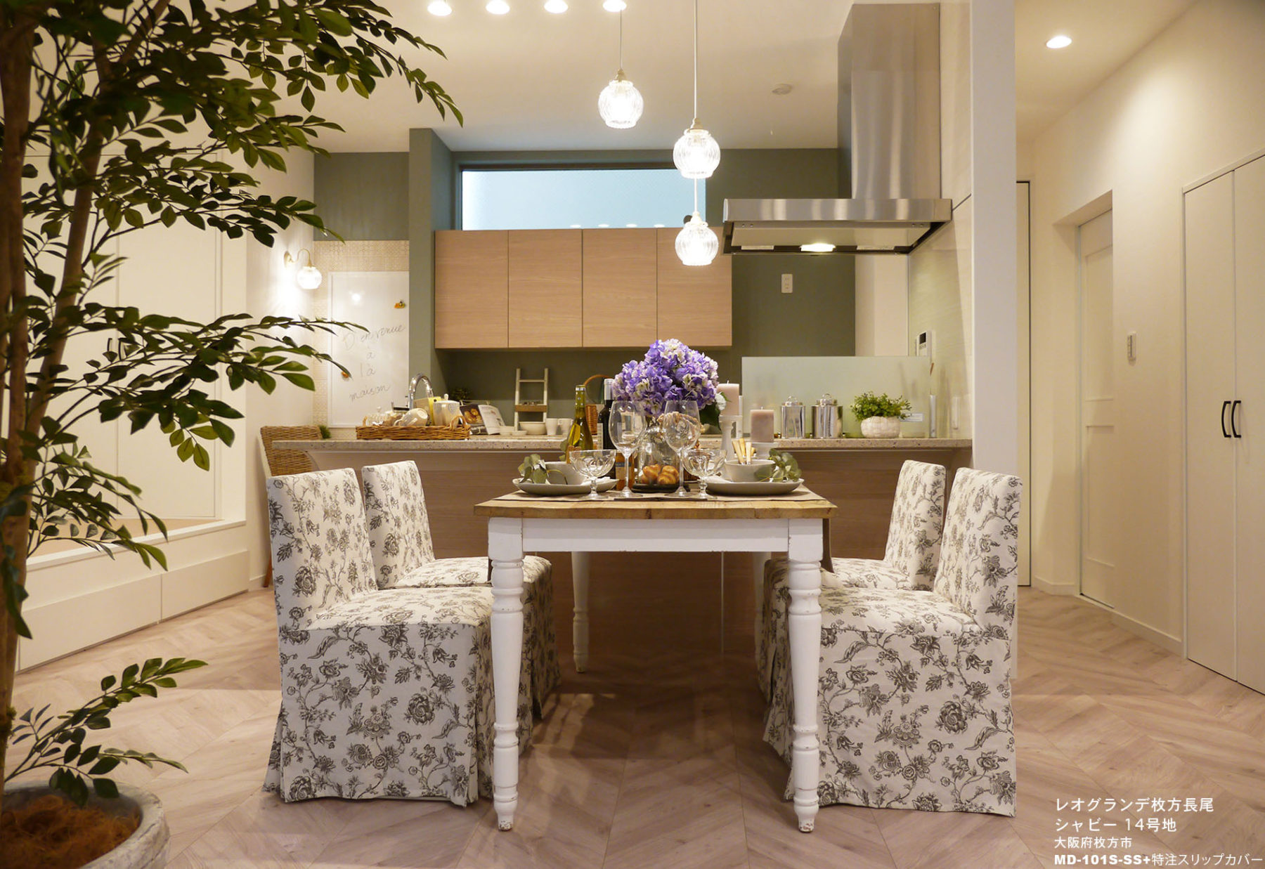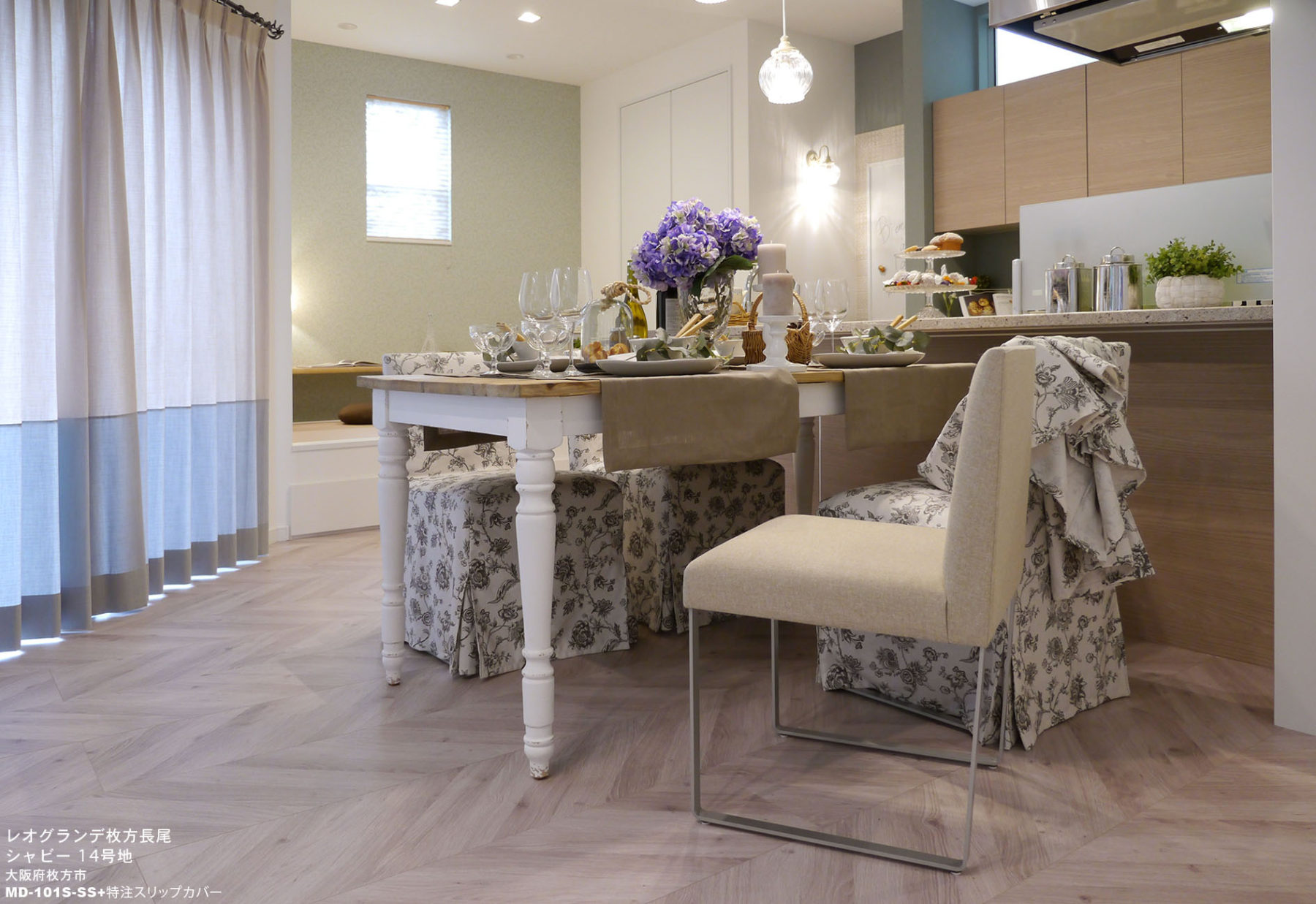 新築戸建分譲街区に完成した、3棟の異なるイメージのモデルハウスの内の一棟、「シャビー(Shabby)」~洗練された “大人かわいいスタイル”~をコンセプトにしたモデルハウスです。ヘリンボーンのグレイッシュな床・淡いブルーやパープルのソフトなカラーをアクセントに、上質感のあるフェミニンなインテリア空間にまとめました。家族の顔が見えるLDKのレイアウトに添って、家族やご友人など、女性の集いのシーンをリアルに演出しています。