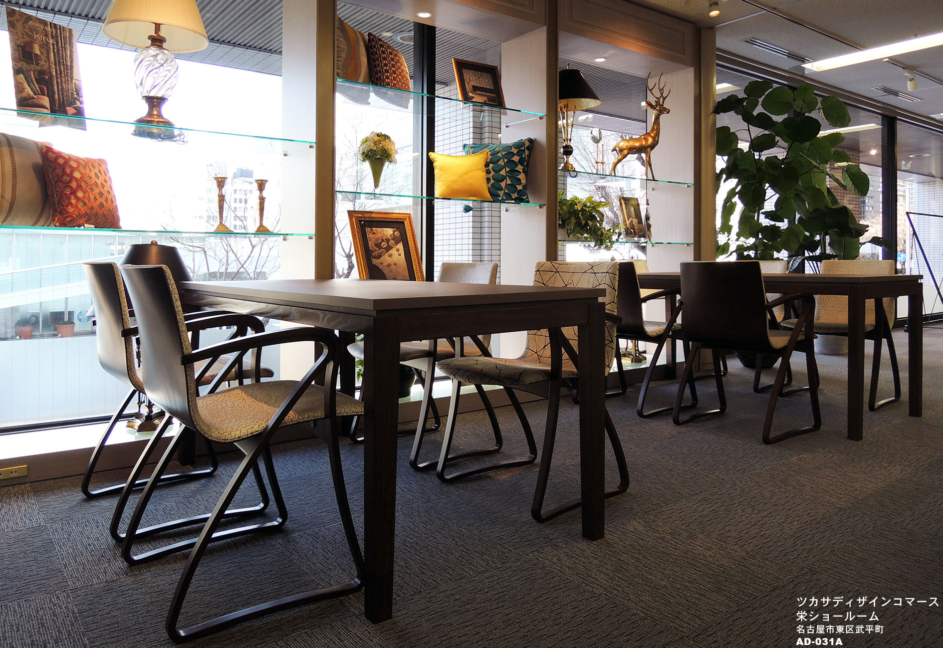全体をグレージュとゴールドのアクセントで統一したインテリアで高級感もありながら、とても落ち着ける空間です。打ち合わせテーブルを4カ所に配し、その椅子に全て柄違いのショールームの海外ファブリックを張って楽しく仕上げました。