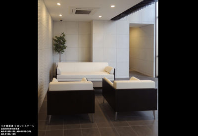 南草津駅前に位置するジオ南草津フロントステージ。 ケヤキ並木が美しい街並みとの調和を図りながら、優美な個性を放つ意匠にこだわりました。 住まう方を見送り出迎えるエントランスは、高さ約4.5mのガラスウォール、 化粧ルーバーによりショーウィンドウのようなスタイリッシュな表情を演出しました。