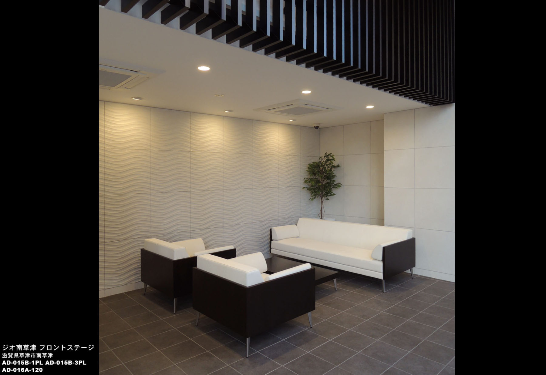 南草津駅前に位置するジオ南草津フロントステージ。 ケヤキ並木が美しい街並みとの調和を図りながら、優美な個性を放つ意匠にこだわりました。 住まう方を見送り出迎えるエントランスは、高さ約4.5mのガラスウォール、 化粧ルーバーによりショーウィンドウのようなスタイリッシュな表情を演出しました。