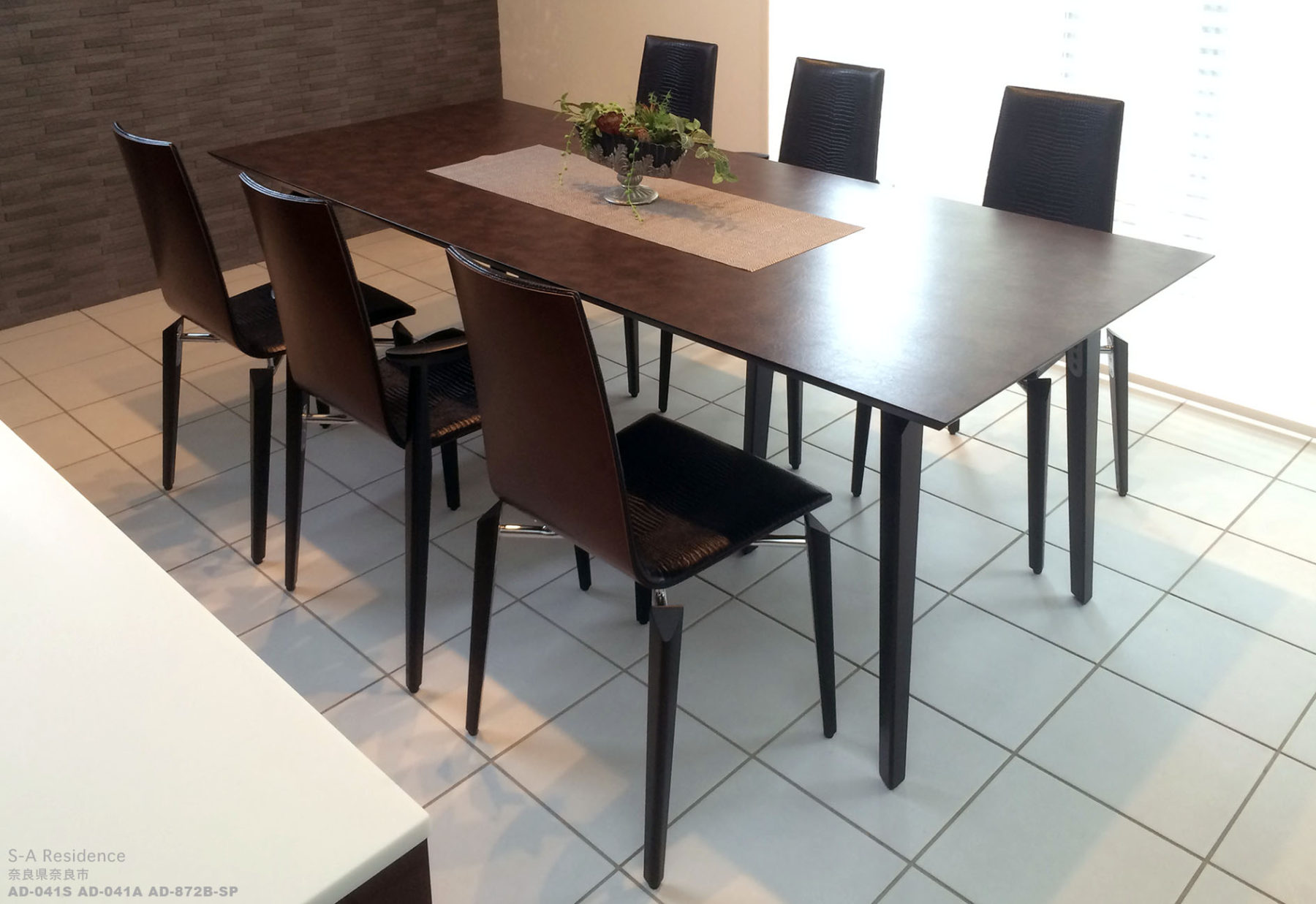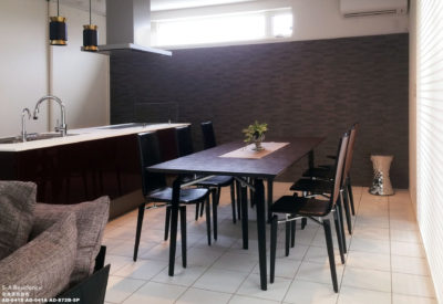 当社製品の採用理由:イメージ・メンテナンス性・ご予算になかなか見合うものがない中、ダイニングテーブルをTVボードと同面材にて特注対応することができたのが採用理由です。その結果、早い段階で気に入っていただいていたクロコ型押しのチェアと一体感がでました。