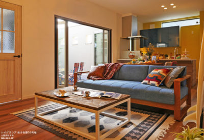 新築戸建分譲街区に完成した、「西海岸キャンピングスタイル」をコンセプトにしたモデルハウスです。大胆なパターンの床材・壁面には古材をアクセントに取り入れ、カジュアル&ヴィンテージスタイルにコーディネートしました。