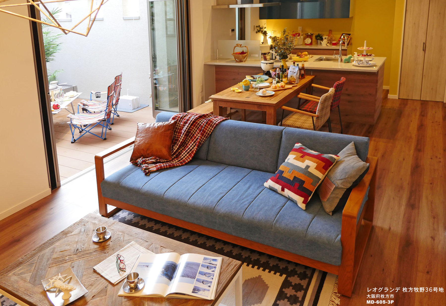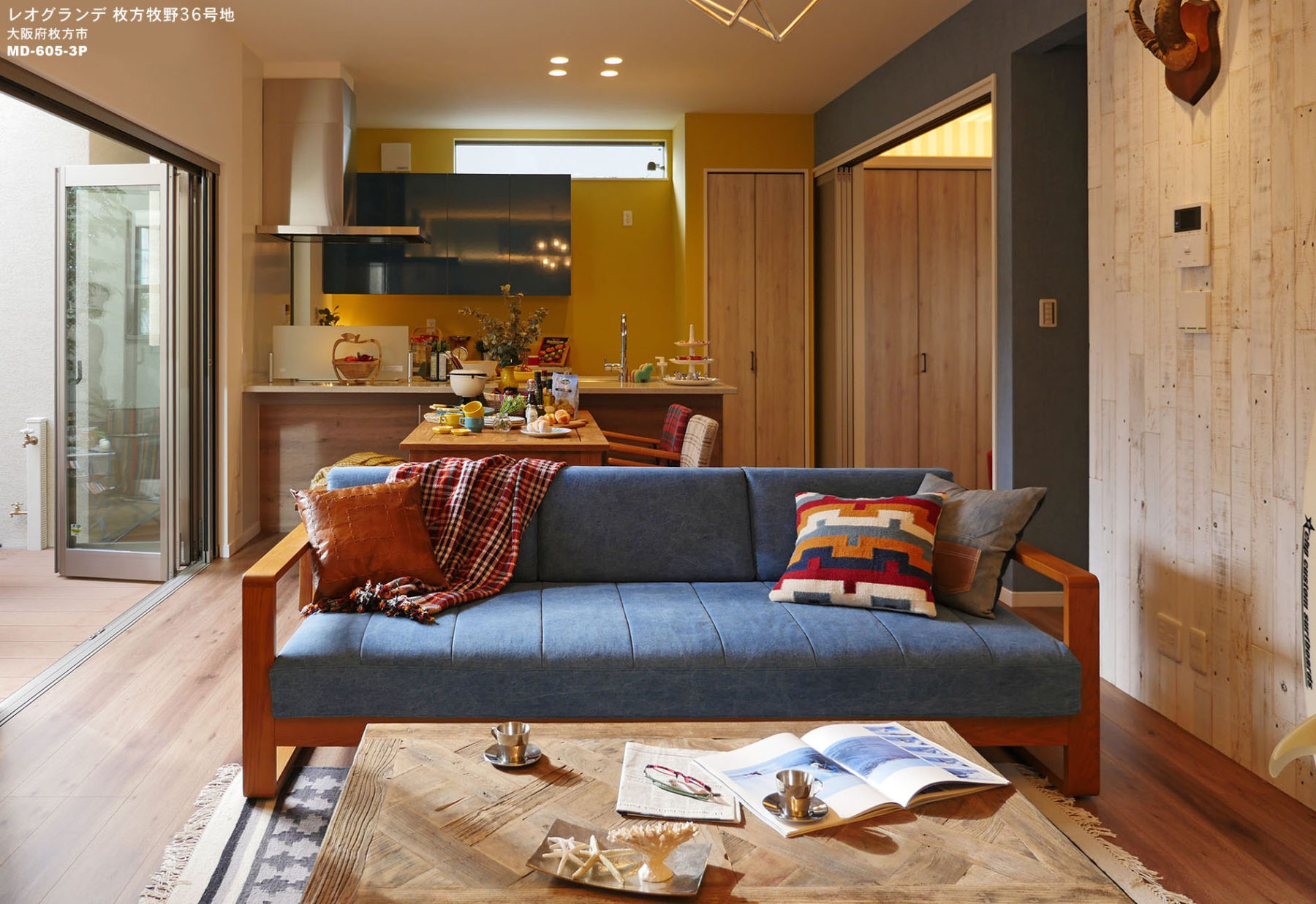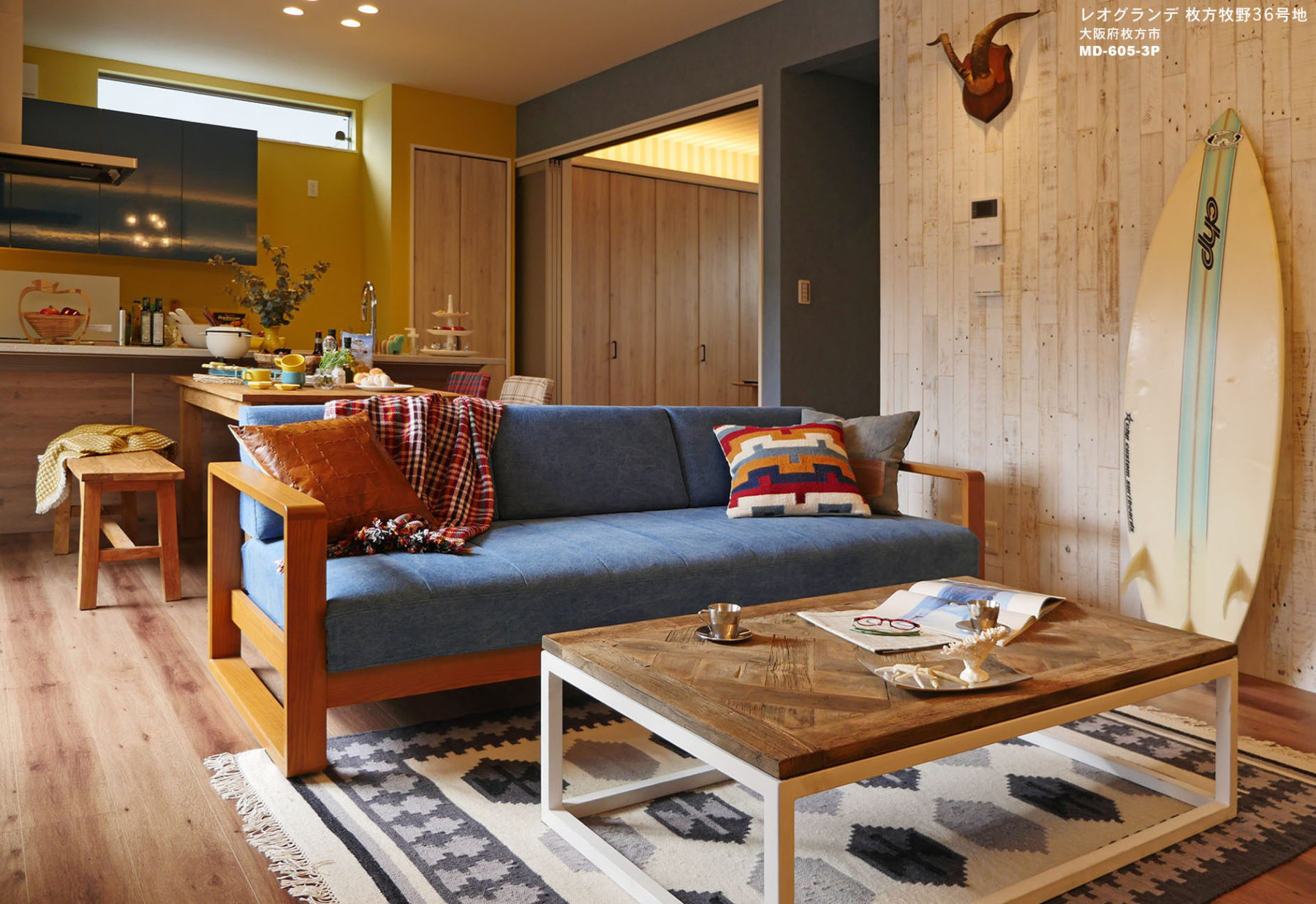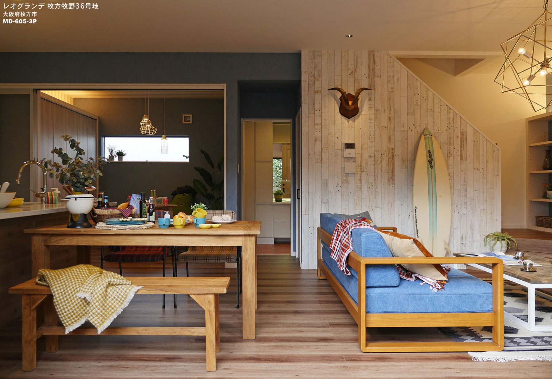 新築戸建分譲街区に完成した、「西海岸キャンピングスタイル」をコンセプトにしたモデルハウスです。大胆なパターンの床材・壁面には古材をアクセントに取り入れ、カジュアル&ヴィンテージスタイルにコーディネートしました。