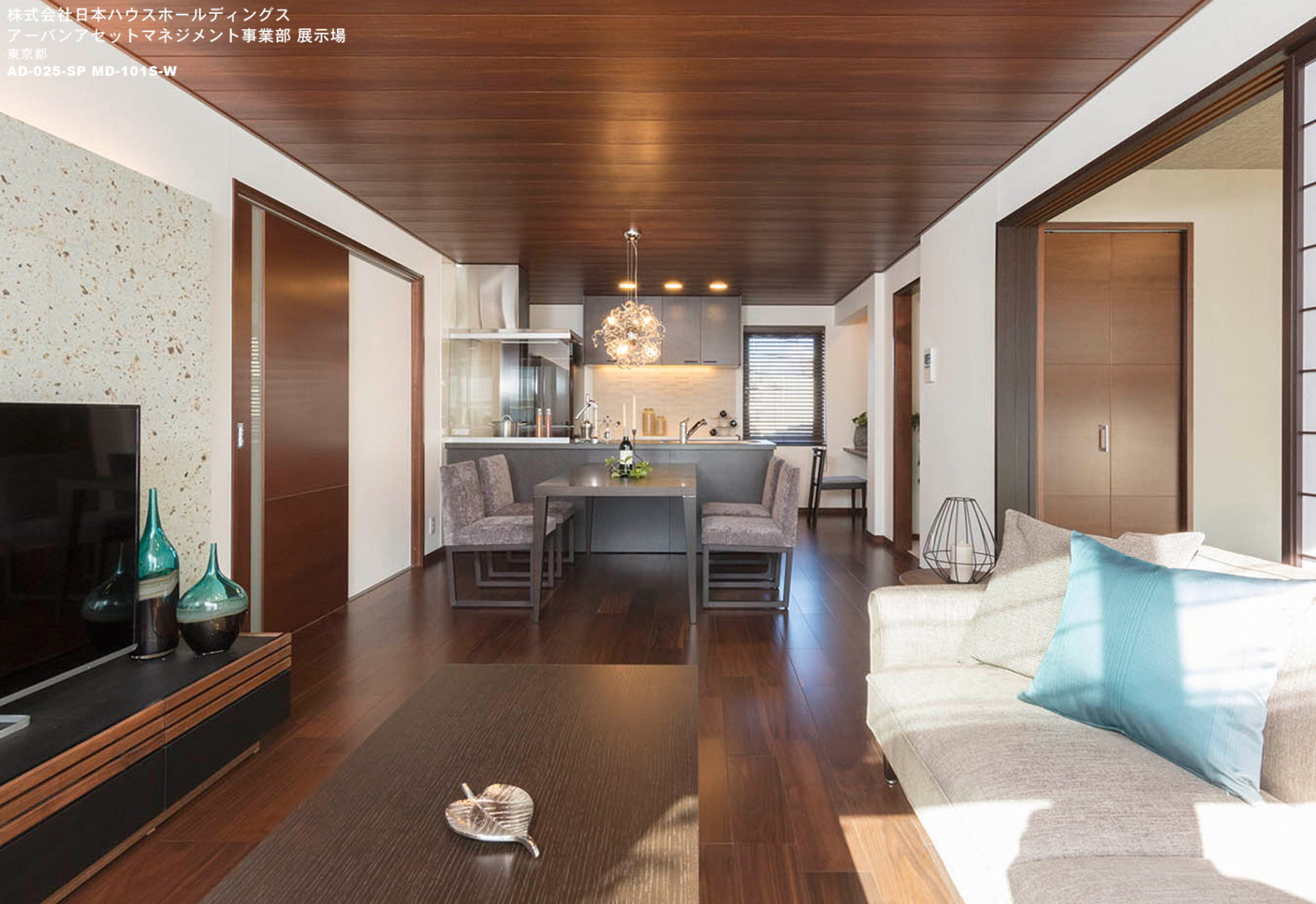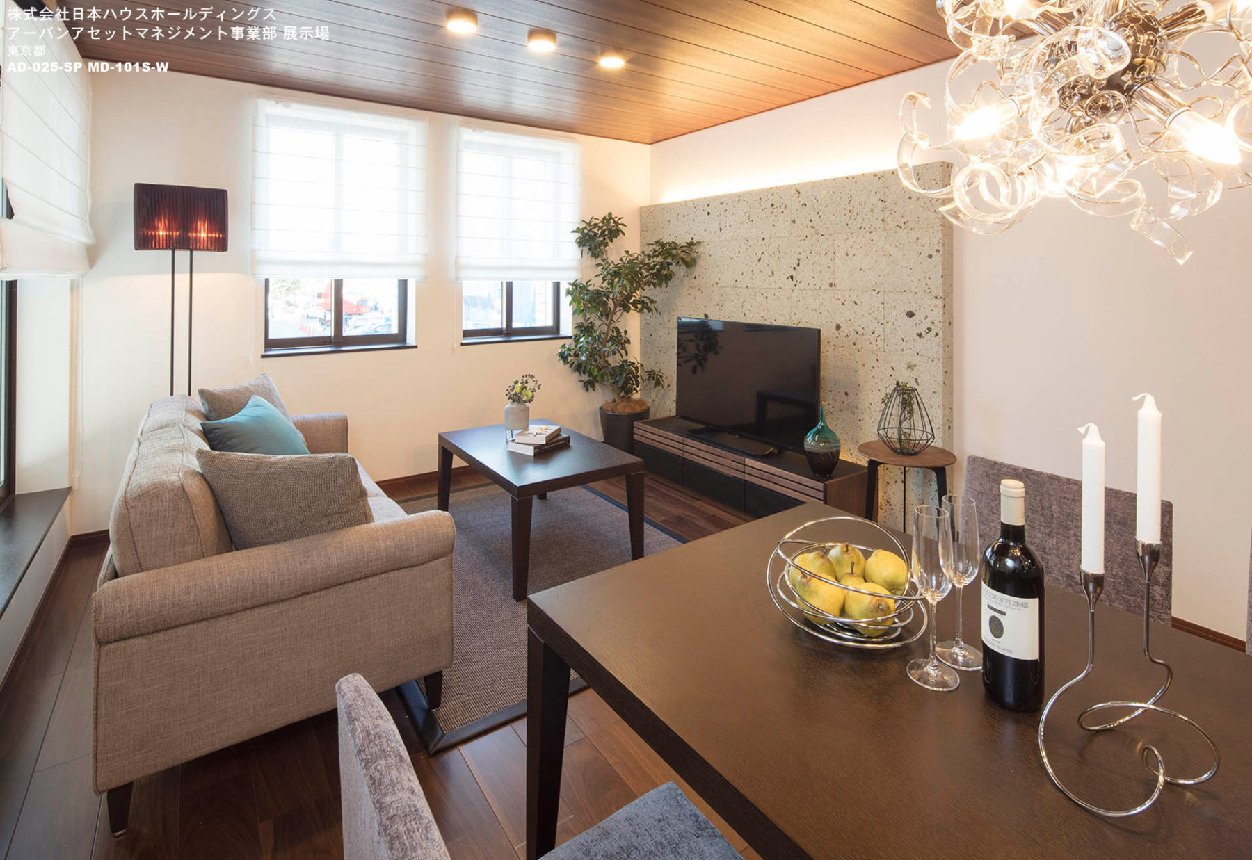 木造耐火建築物の資産運用住宅モデルです。リタイヤしたオーナー様ご夫婦のLDを想像して、落ち着きと高級感をウォールナットや大谷石、チーク等を使用しつつ。タイトな空間内に表現しました。