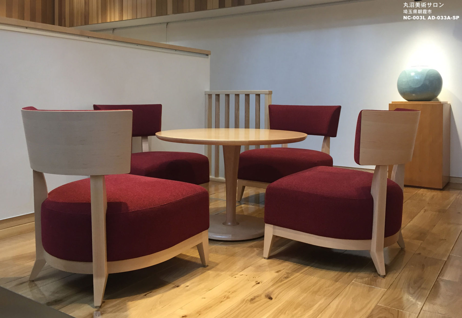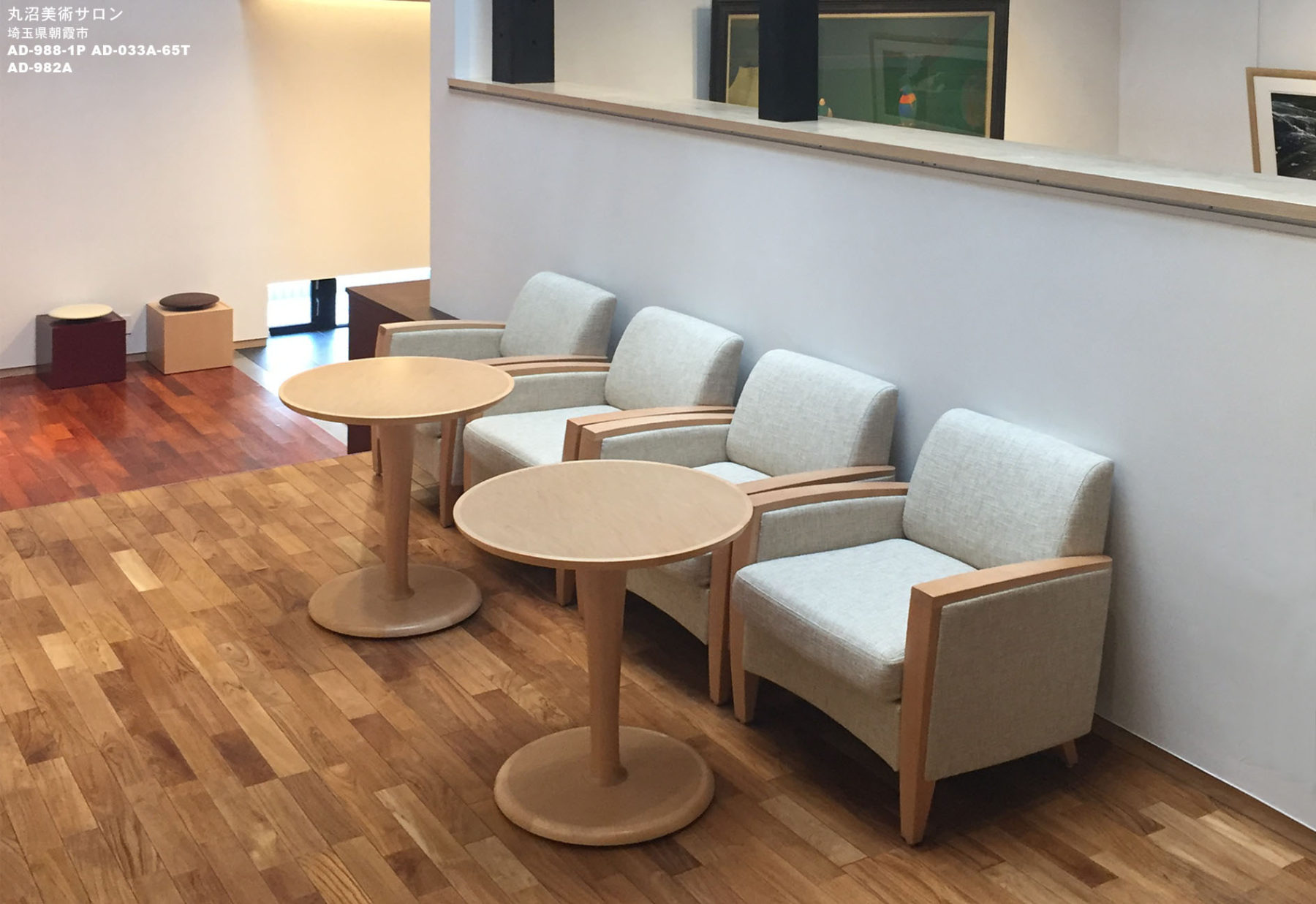 古民家から移築した存在感のある梁や柱がモダンな空間のアクセントとなっています。様々なアートに囲まれながらバームクーヘンやお茶を味わい、ゆったりとした時間を過ごしていただきたいというサロンの趣旨に添えるような家具を選びました。