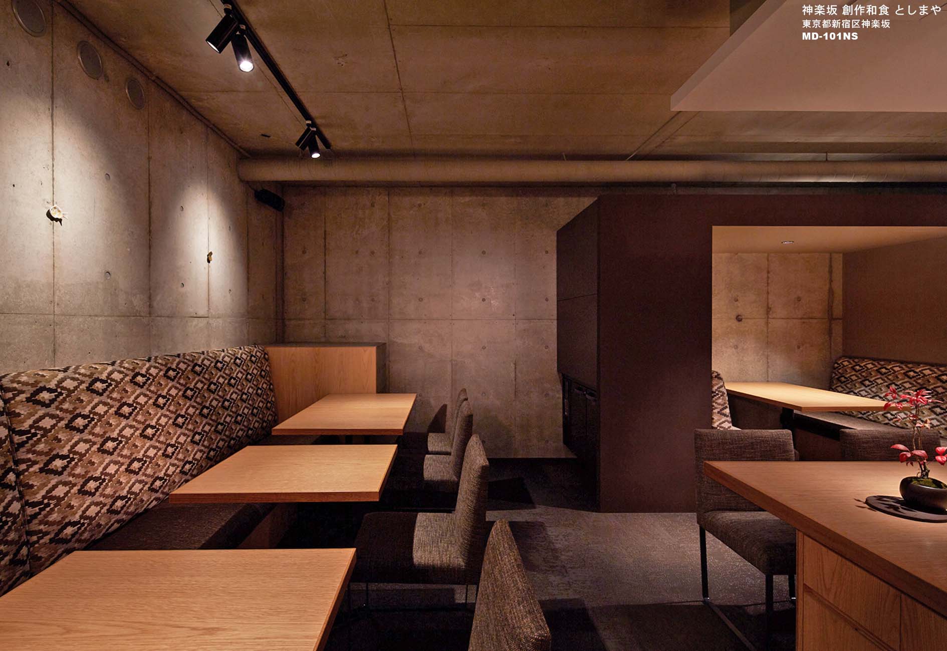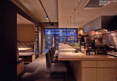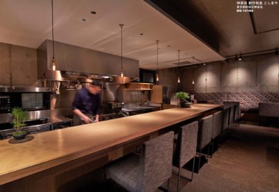 料理だけでなく、食器や内装にも洋のエッセンスを取り入れ「和モダン」として統一感を持たせた空間は、打ちっぱなしのコンクリートの空間をベースにシンプルなボリューム配置だけで構成することで、とても居心地がよくゆったりとお食事を楽しんでいただけます。