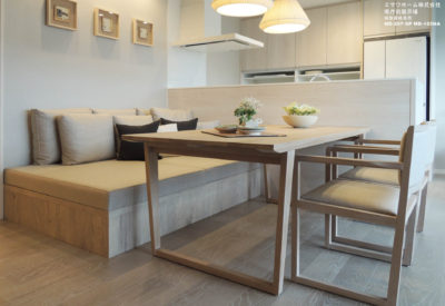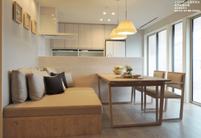 木の温もりの感じる優しい雰囲気の中で、家族が揃って会話をしたり、寛いだり出来る空間をイメージしコーディネートしました。また人気のヴィンテージ感もプラスしました。