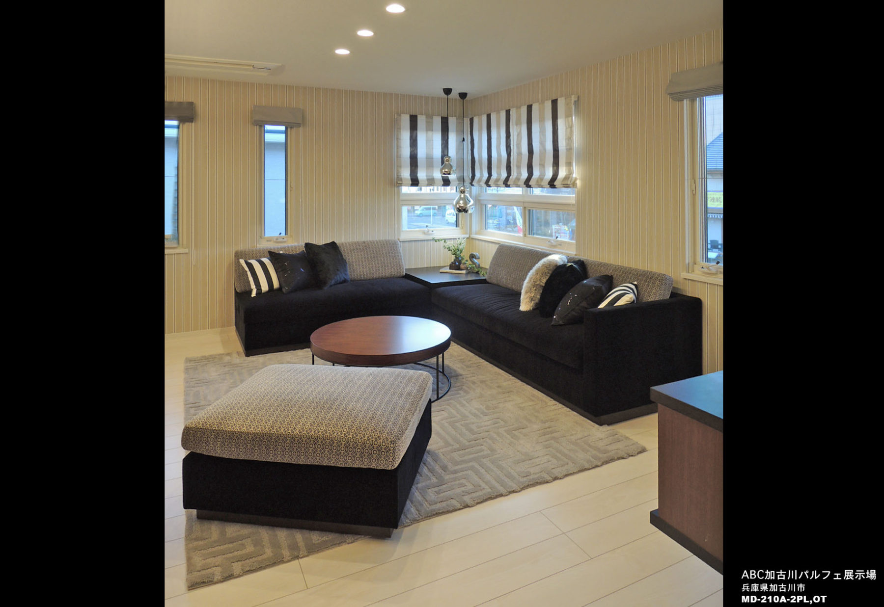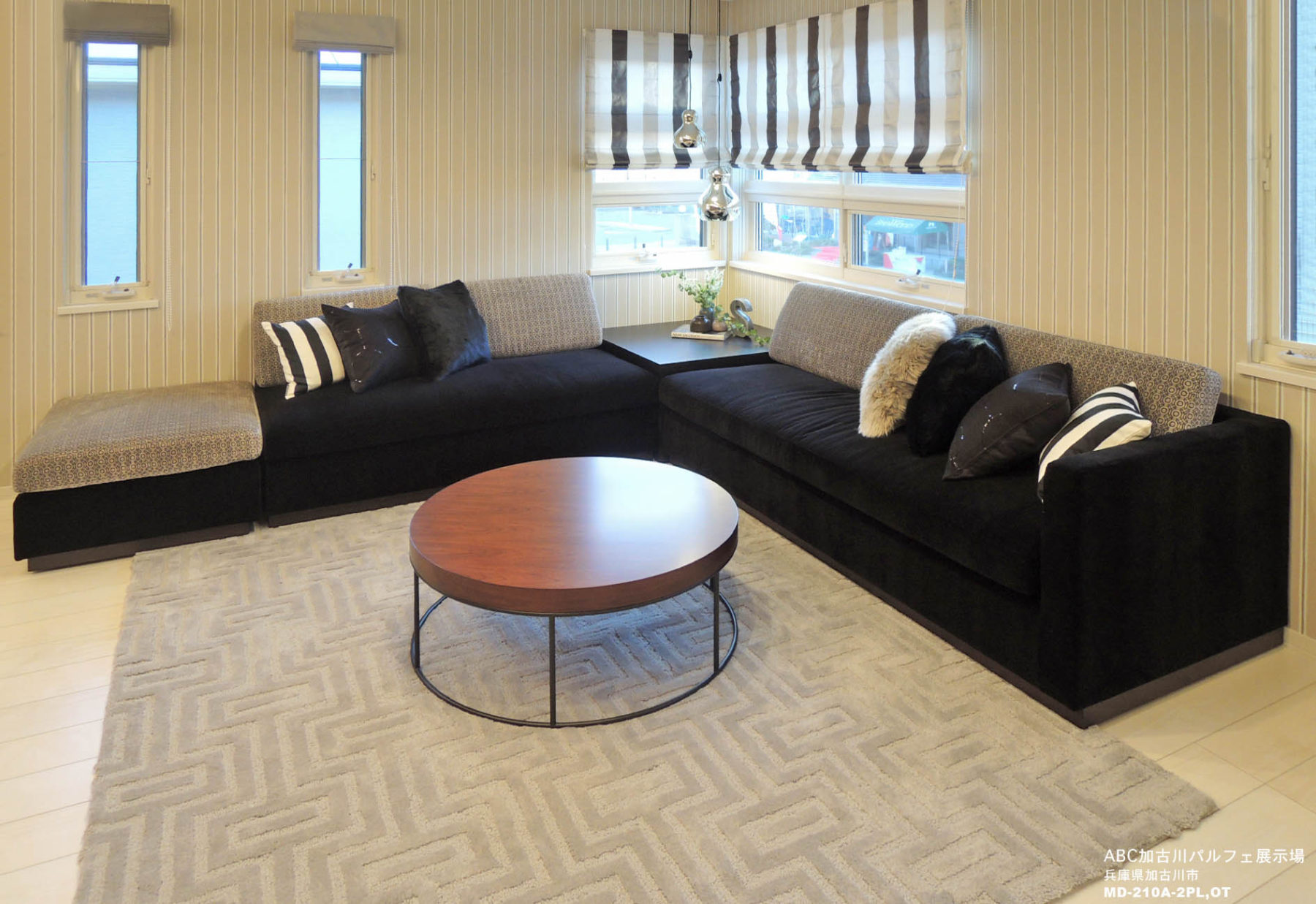 子世帯のLDは、モノトーンを基調としたモダンなインテリア。低座でボリューム感のあるソファの黒と背クッションの幾何学模様の貼地が、空間に存在感をもたらします。トレンドの幾何学を背クッション・ラグなどに取り入れ、ストライプでシャープ感を強調し、モダンを意識しながらも、どこかラフさも感じさせる空間となっています。