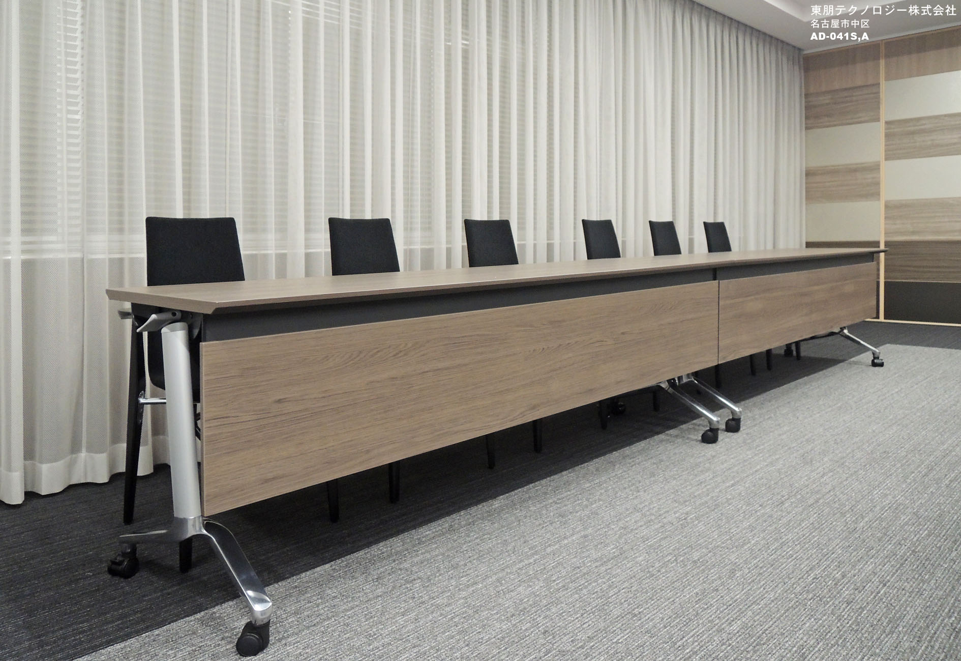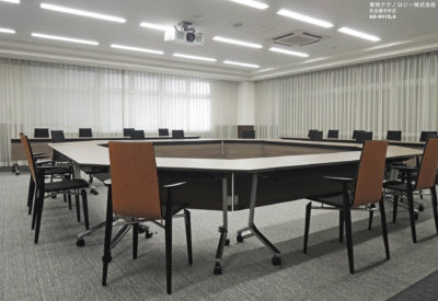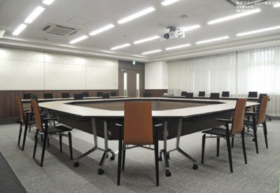 室内は木の材質を活かしながらも和風モダンな色調で、一般会議、テレビ会議、講習会、プレゼンテーション等、多目的利用に対応できるインテリアとしました。