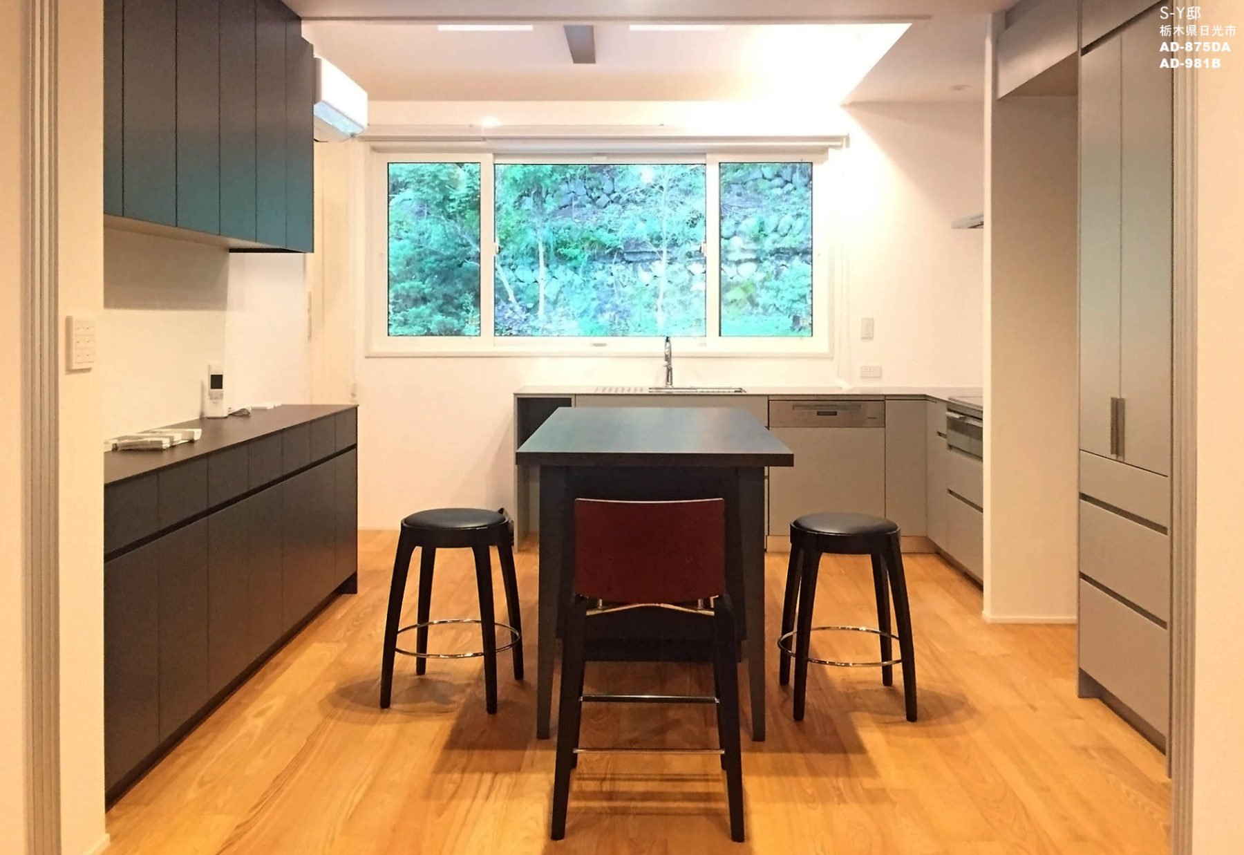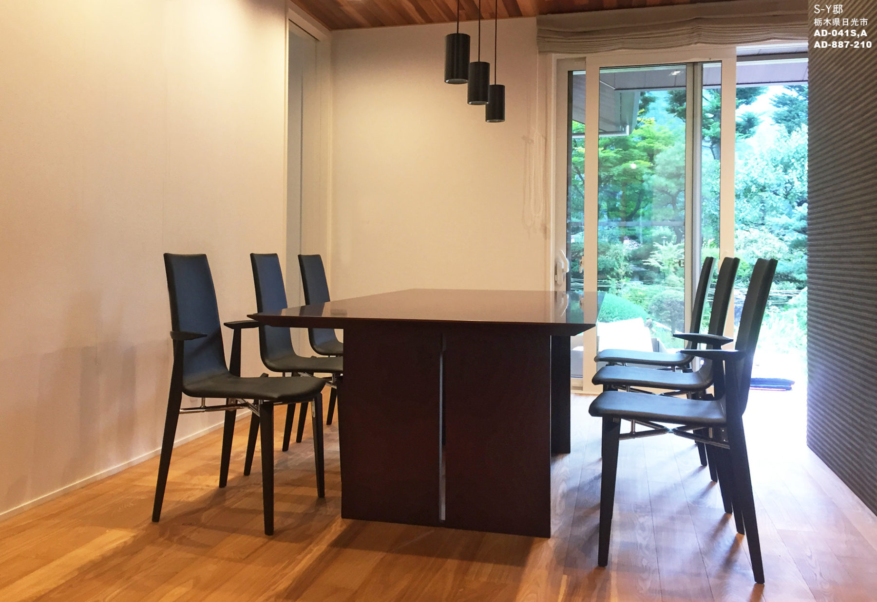 風光明媚な山合いの景色に囲まれ、お父様と息子様ご夫婦の大人3人暮らしの住まいです。ウォールナットの床材、レッドシダーの天井材、壁のグレー色のタイルに合うシックでモダンな落ち着いた空間に似合う家具を提案しました。