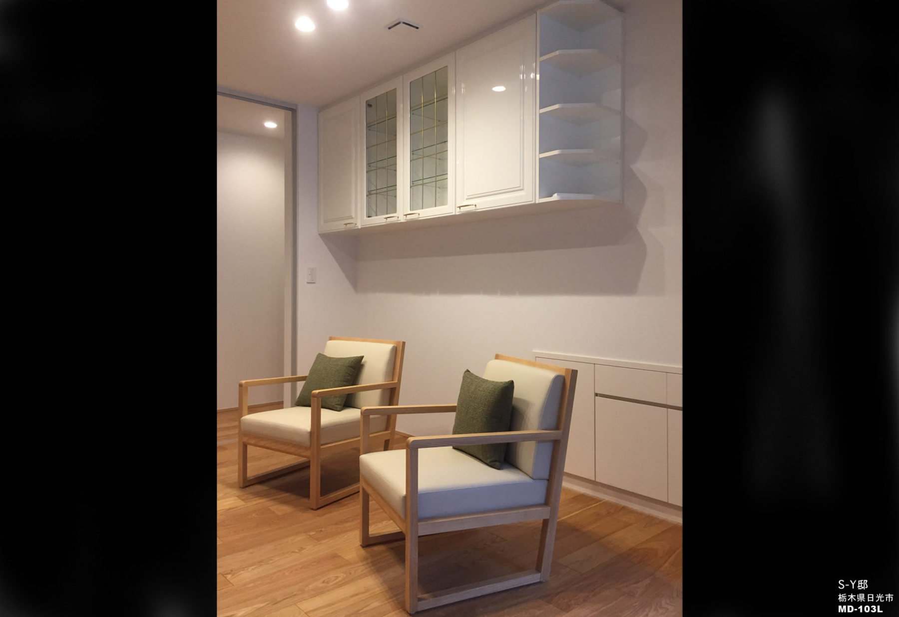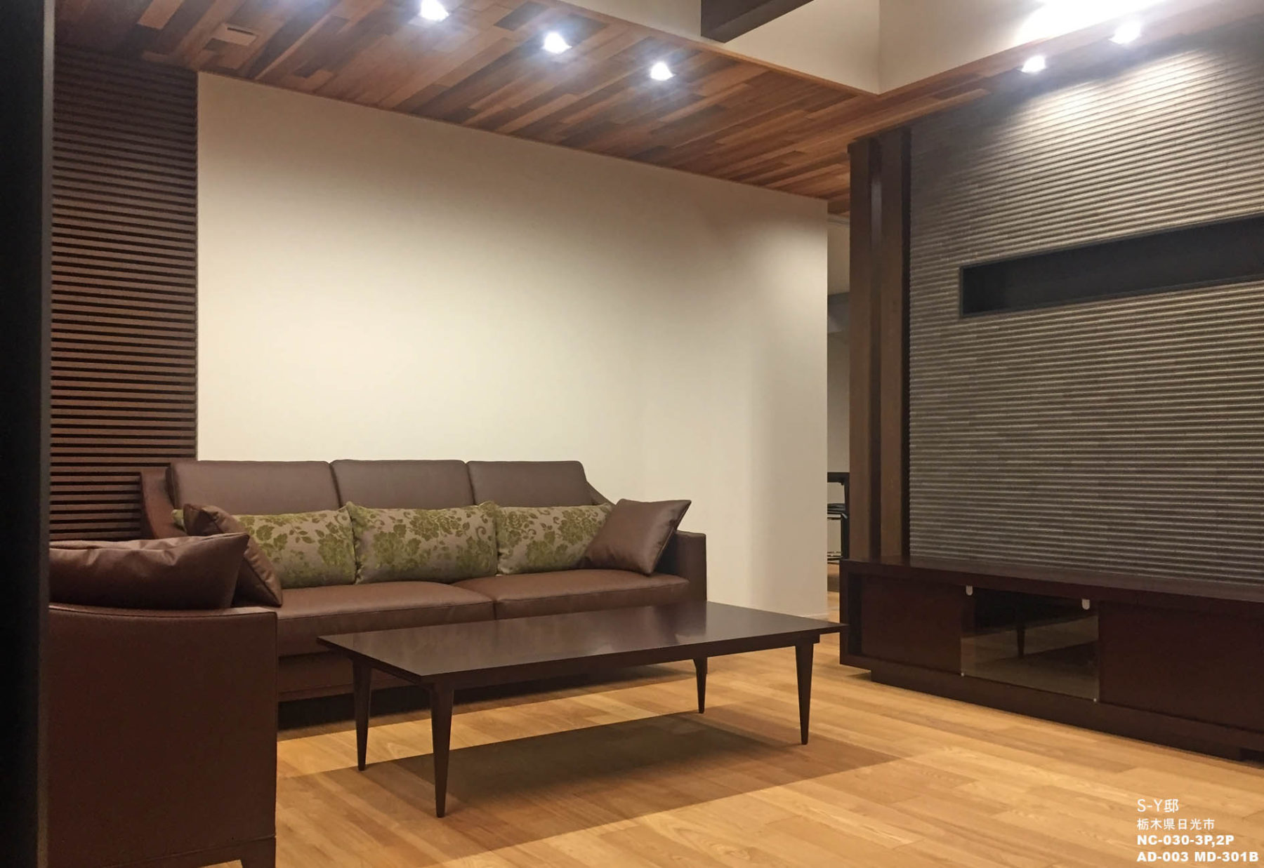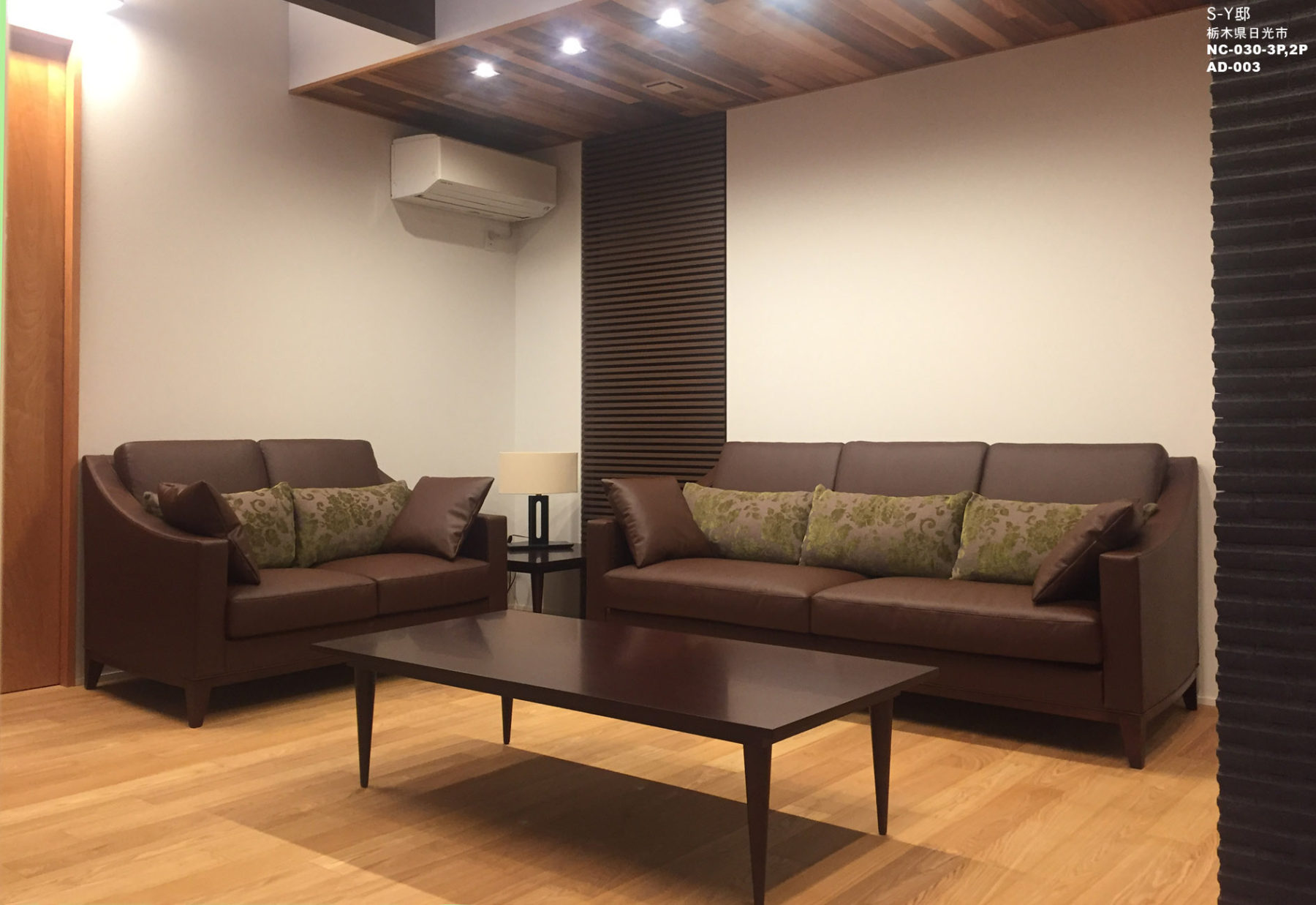 当社製品の採用理由:NC-030ソファは、肘のアールのデザインが手をつき立ち上がり易いとご高齢の方に好評でしたので今回もお勧めしました。木部色とTVボードも同色に合わせ、ソファの脚もお掃除ロボットに合わせて高さ調整をする等特注の対応が細やかです。