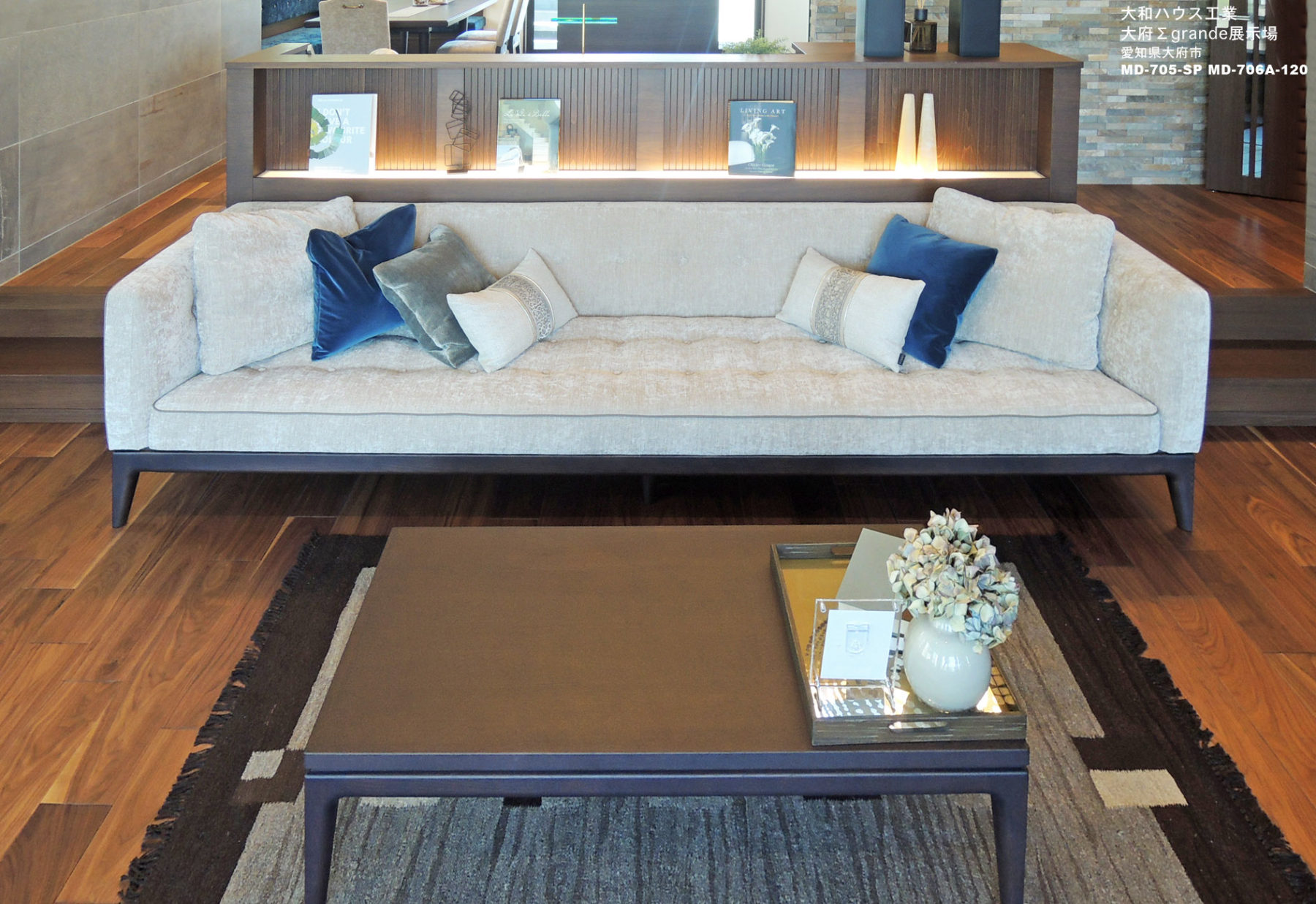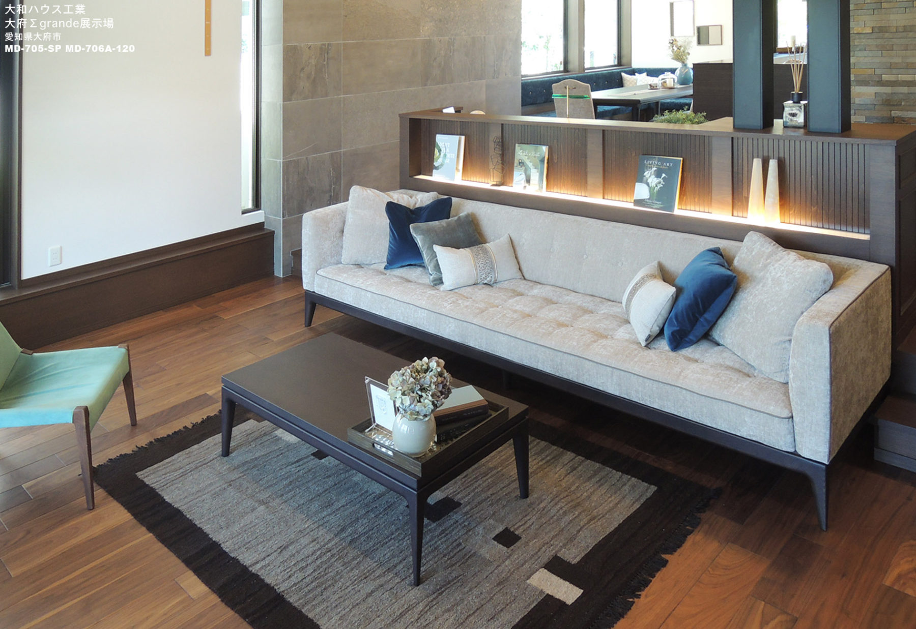 当社製品の採用理由:デザインがインテリアテイストに合っていた点と、ソファのサイズオーダーが可能だったため。