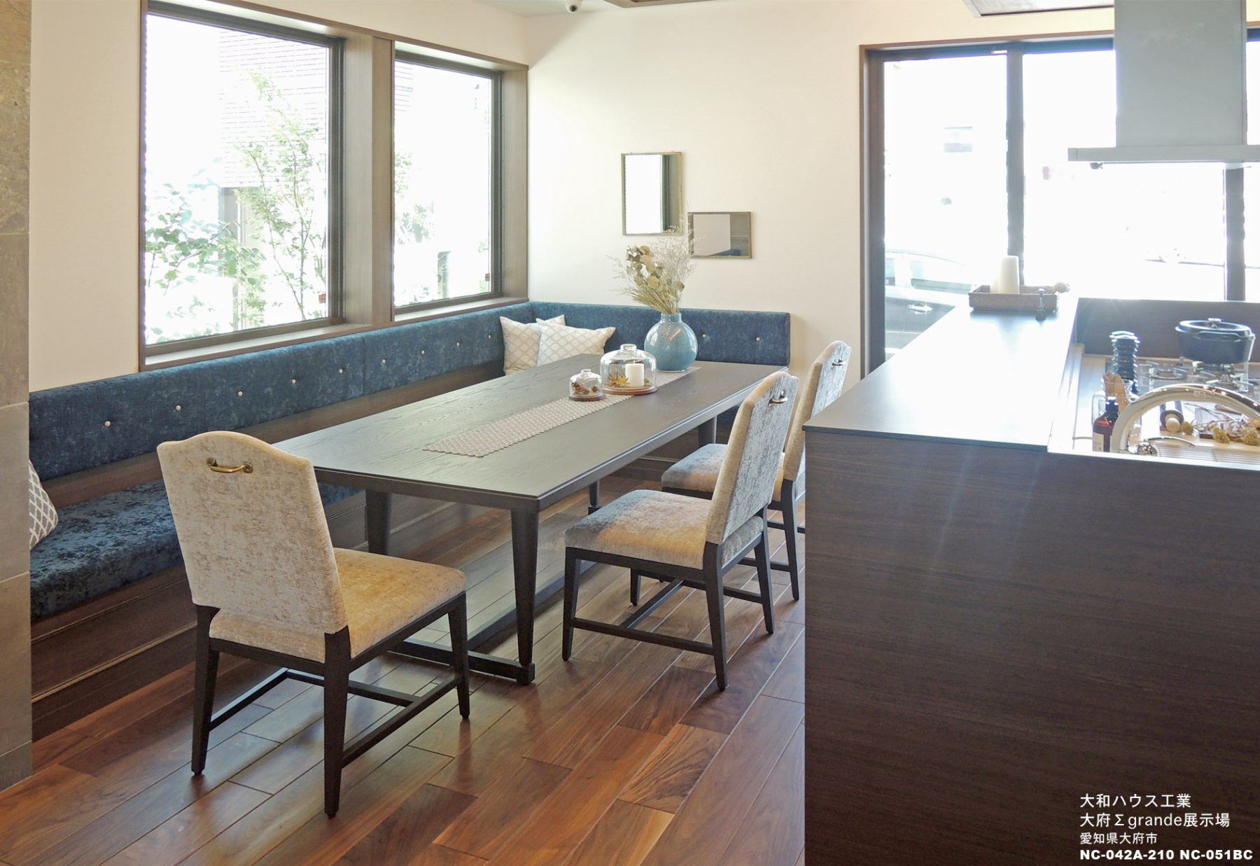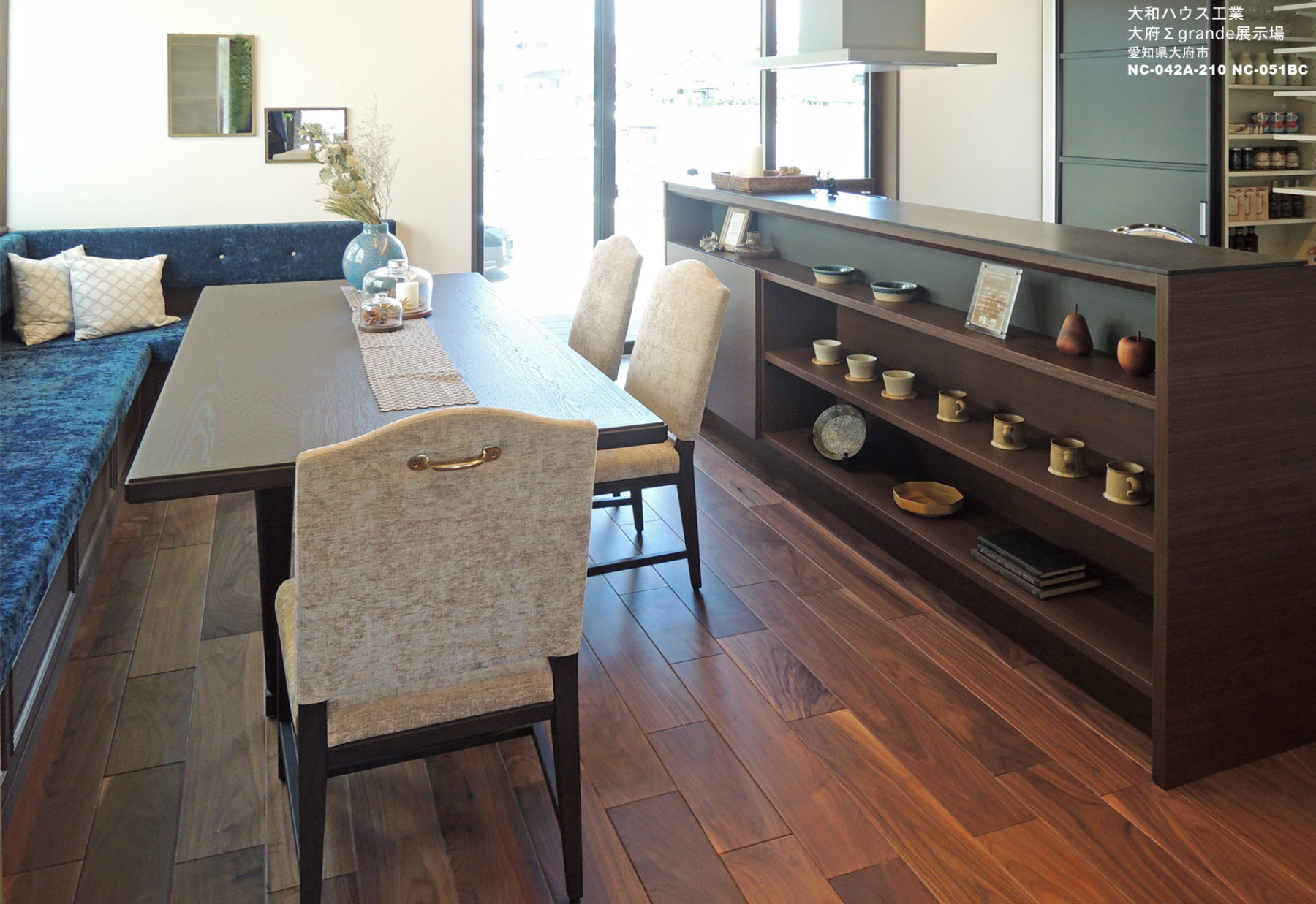 ウォールナットの無垢床や折り上げ天井を取り入れた重厚な雰囲気にモダンテイストをMIXしたインテリアです。