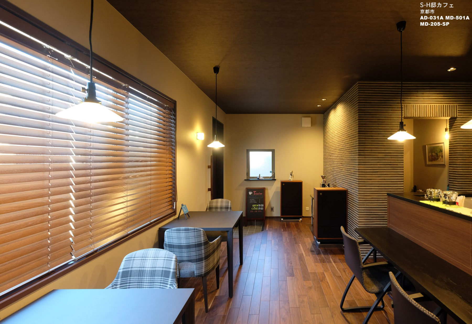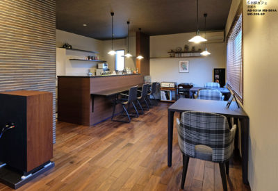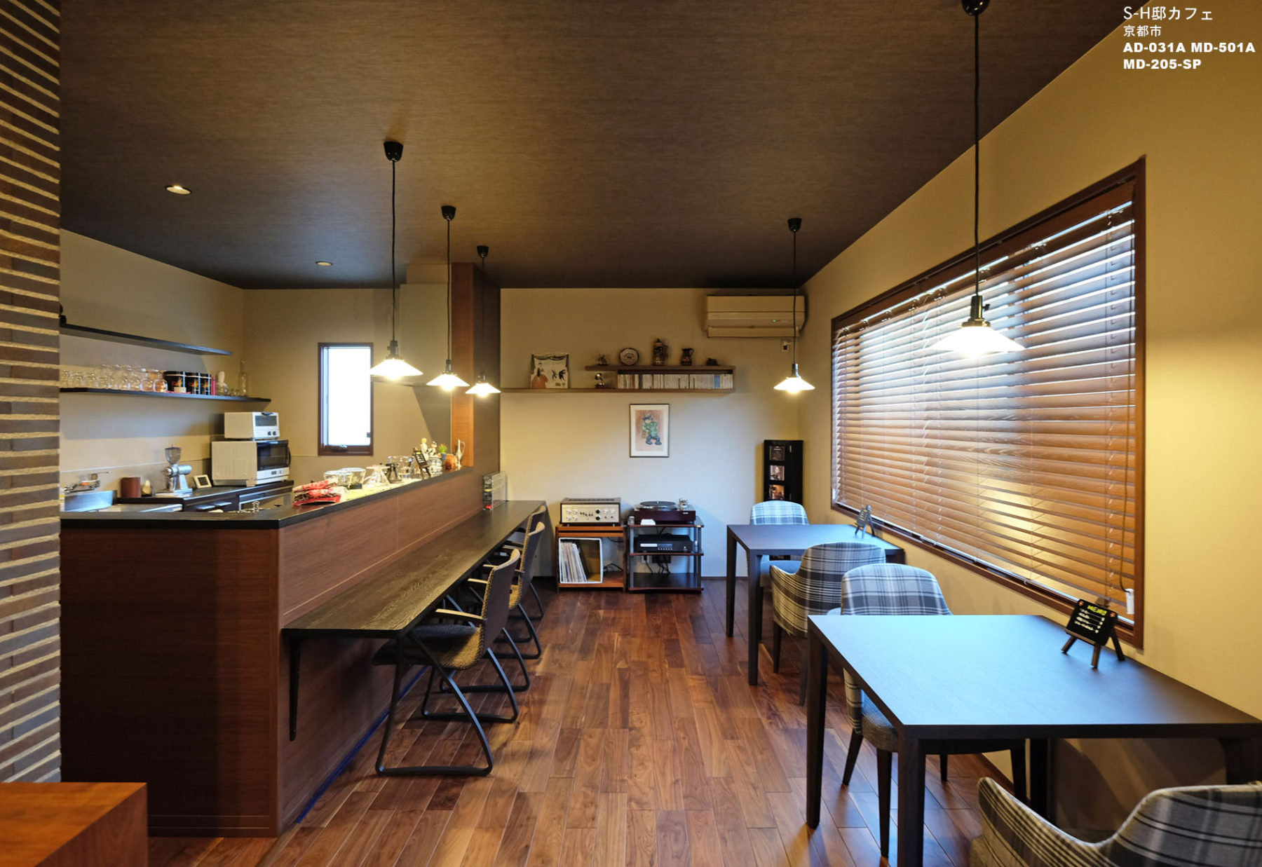 店舗併用の住宅です。喫茶店に来られるお客様はもちろん、施主様ご自身にとっても居心地のよい空間になるように心掛けました。挽板ウォールナット・無釉タイル・色を落とした天井・木製ブラインド・レトロなペンダントによって、音楽とコーヒーが似合う落ち着いた空間を目指しました。