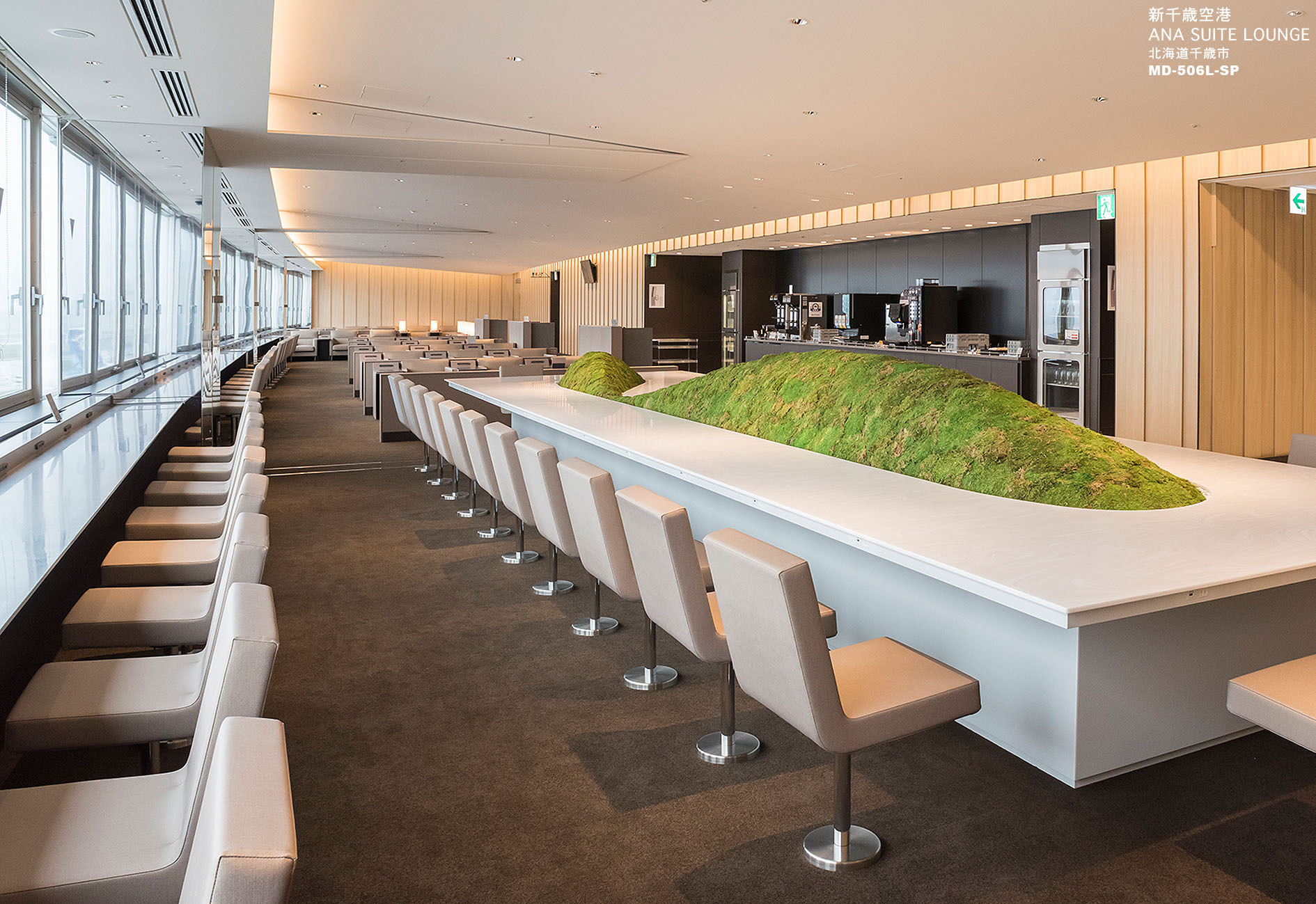 滑走路に面した東側は全面ガラス張りの大きな窓を設け、遠くには北海道の山々も望める明るく開放的な空間に生まれ変わりました。