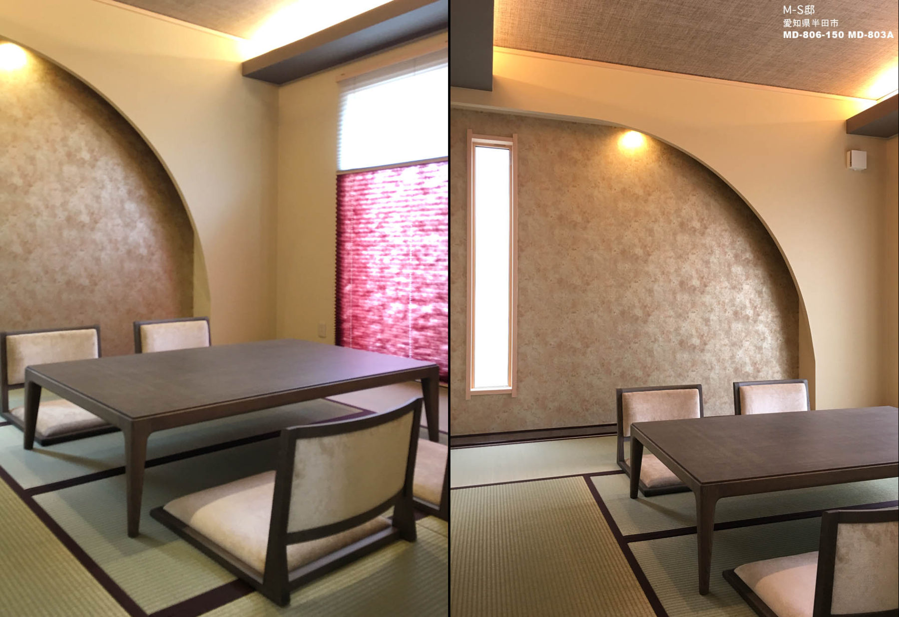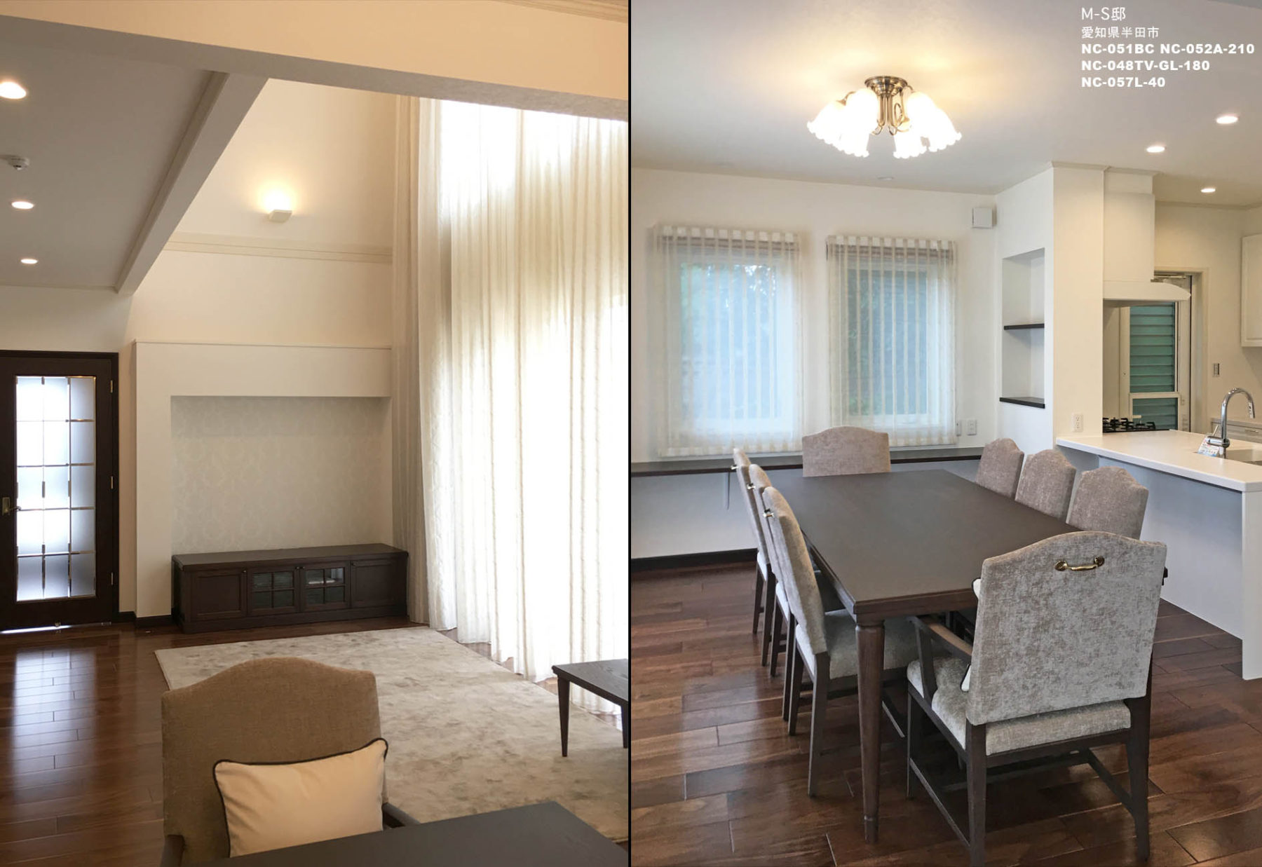 家族構成はご夫婦と犬です。広々としたリビングは床暖房で、ソファは置かずカーペットの上で愛犬と過ごしたいというご要望でした。全体的に落ち着いた色合いの家具を配置し、奥様のお好きなエレガントシックにまとめました。お客様をお通しする和室は、モダンな作りとし、間接照明を配する事でちょっとした割烹旅館を思わせるような一室となりました。