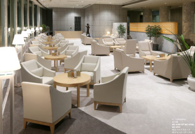 スイートラウンジをコンセプトとし、アイボリー系のユニゾンカラーでまとめた上品な空間としました。⼤きな開⼝部に設えたホワイトルーバーが、外とのつながりをより強く意識させ、また特注のフロアスタンドの光が⾼天井の中のヒューマンスケールの居⼼地のよさを演出しています。