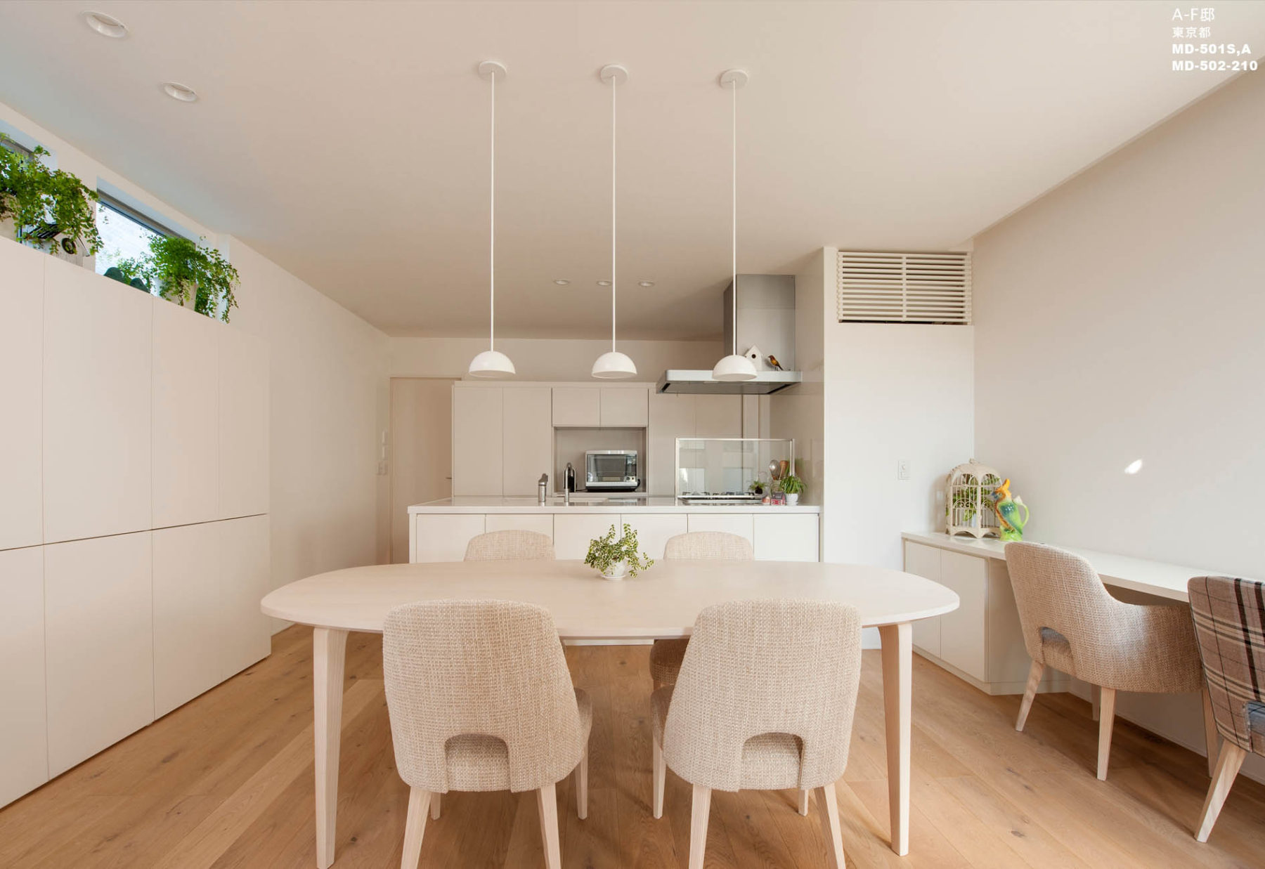 丸みのあるデザイン家具でやさしい印象に仕上げました。また、柔らかなホワイトを基調とし、グリーンが映える穏やかなリビングダイニングは、明るく、安らぐ、温かく 、自然、かわいい、やさしい、グリーンをテーマにした空間です。