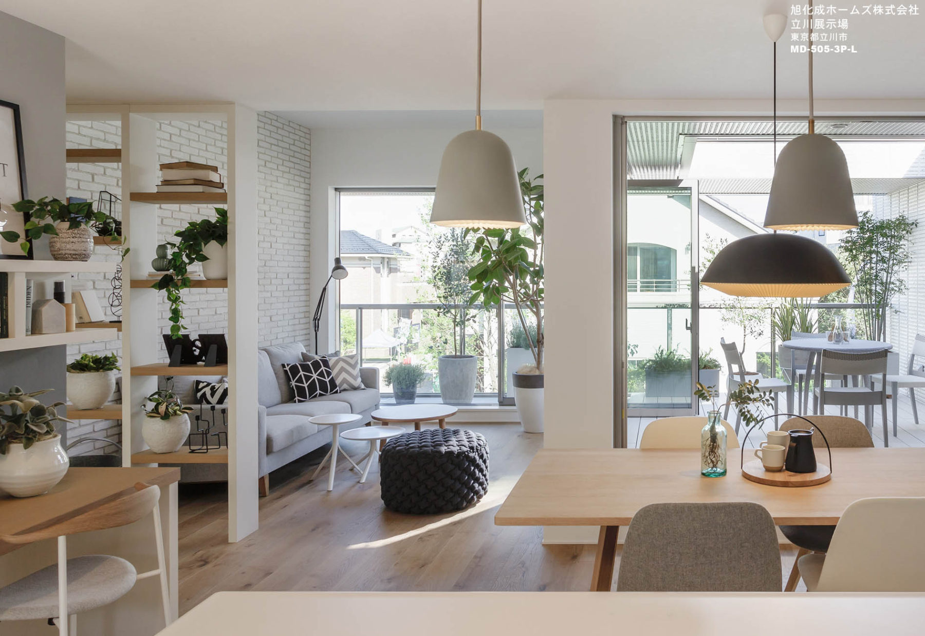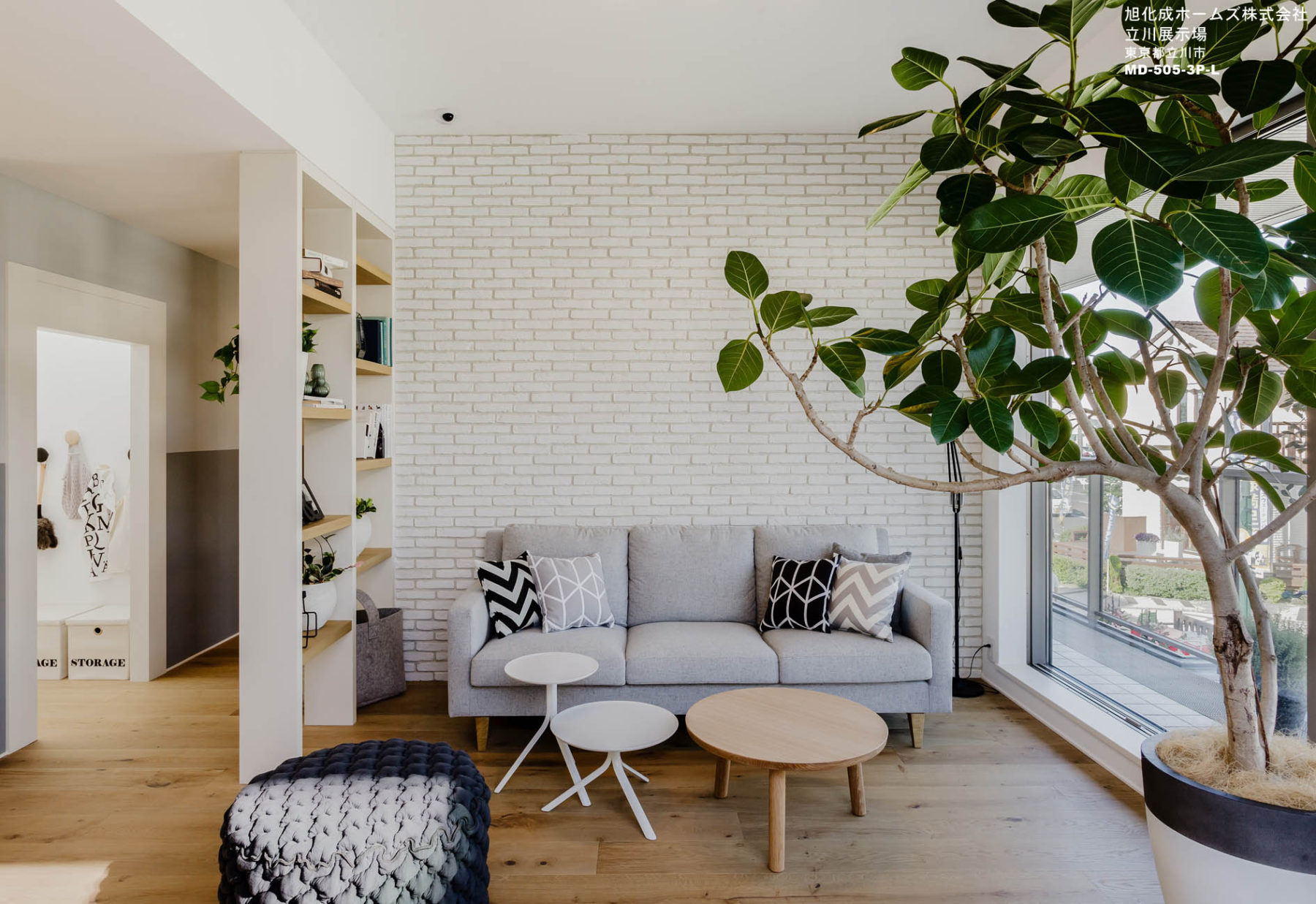 無垢の床材、ブリックタイルの内装材にホワイト色とナチュラル色をベースとした中に優しいグレーとブラックをアクセントにしたLDKです。大きな窓から光と風を取り込む、明るく開放的な空間となりました。