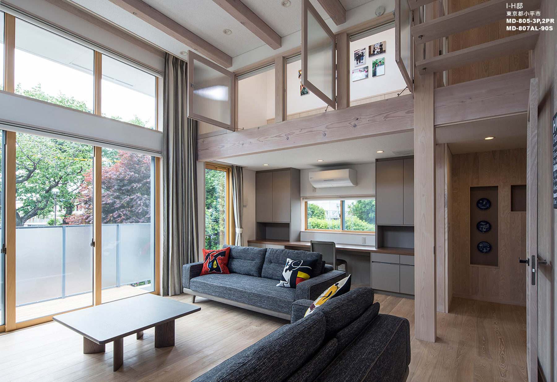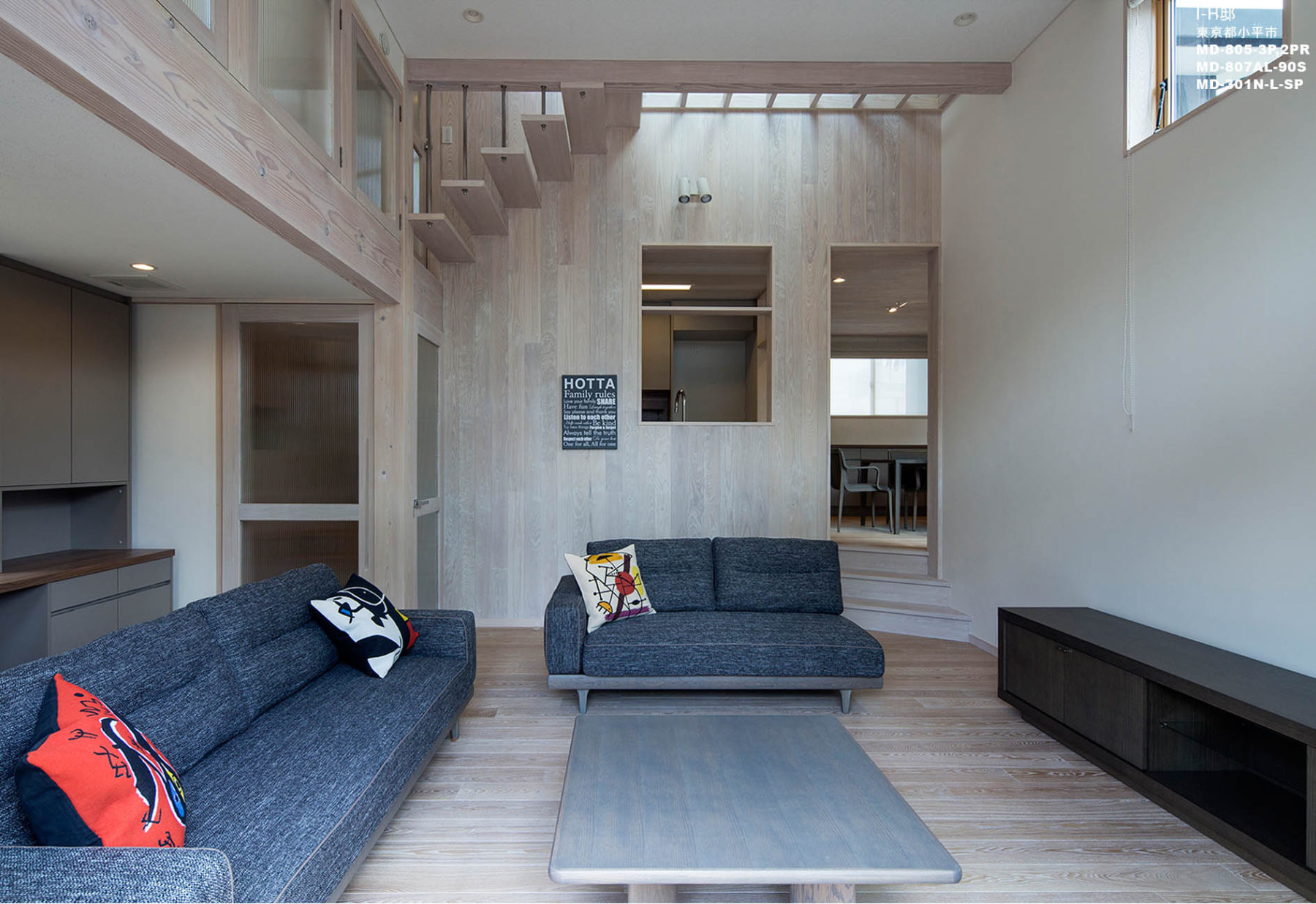 吹き抜け、ステップフロアなど建築的な特徴を壊さないようにシンプルでモダンにまとめることを心がけました。色的にも白、黒、グレーですっきりと仕上げています。