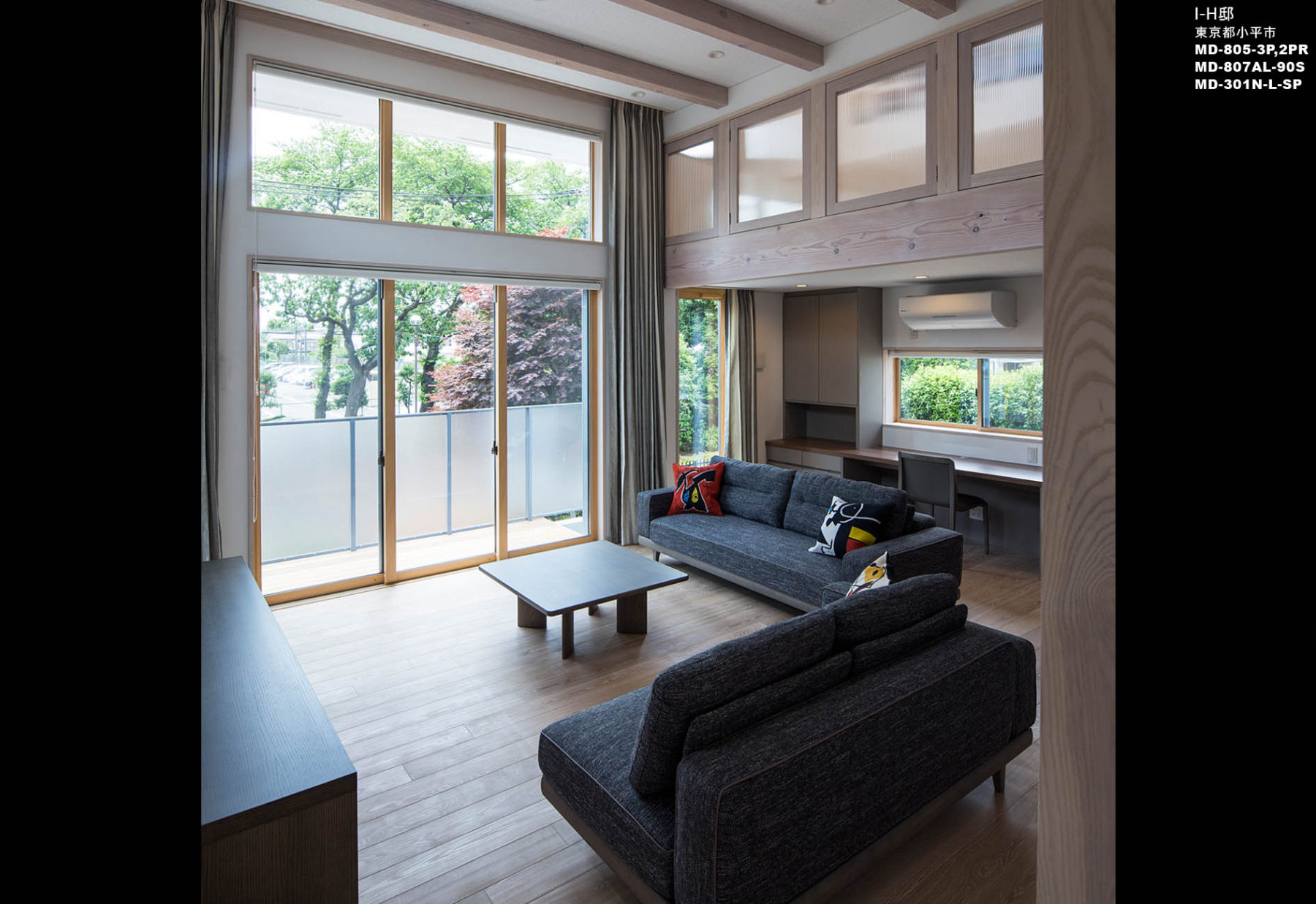 納入後の感想:ホワイト塗装木部の中でグレーの家具がしっくりとなじんでいます。また、カバーリングのソファはカジュアルな印象のものが多いですが、今回使用のMD-805は、グレード感があり空間をより引き立ててくれました。