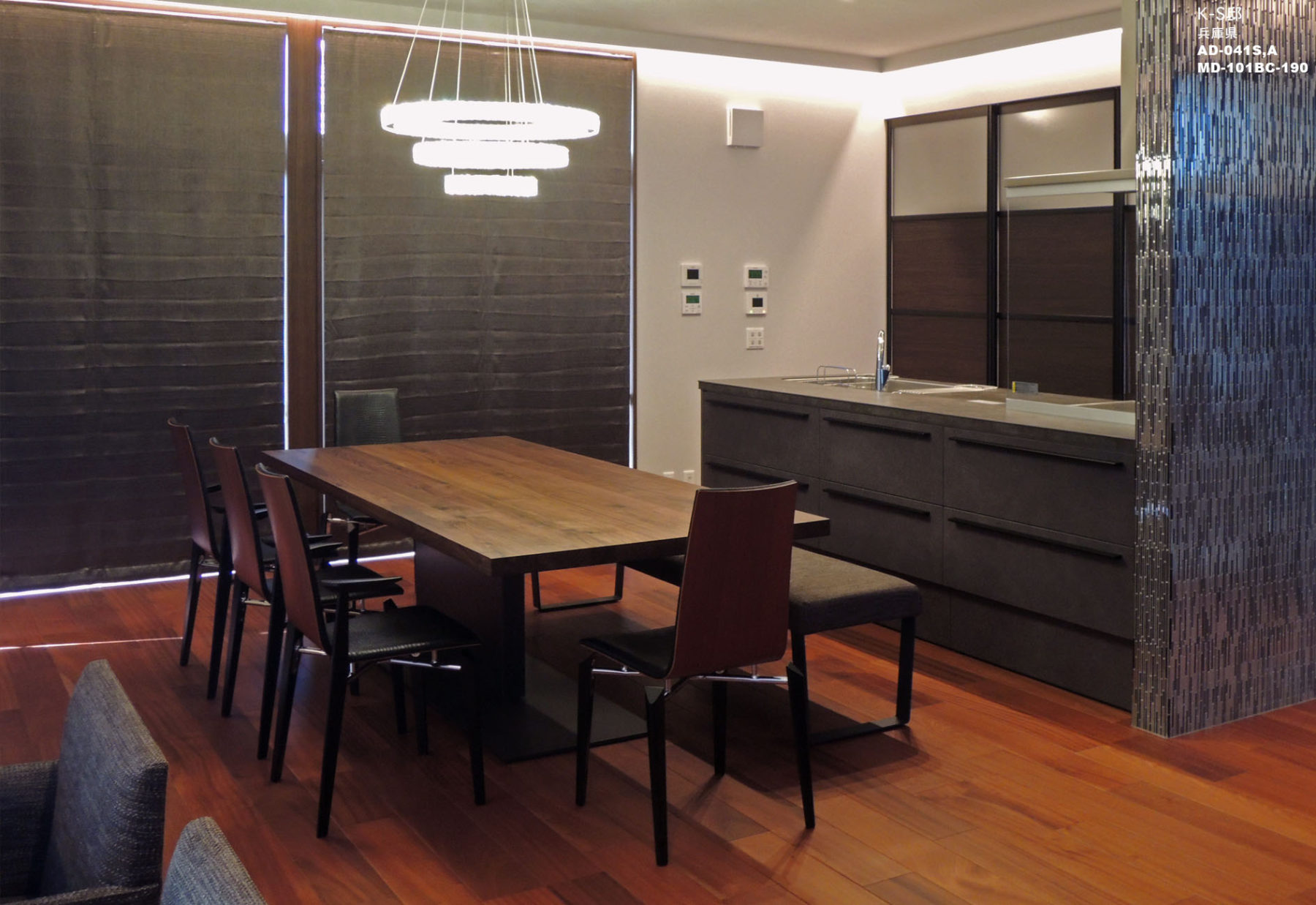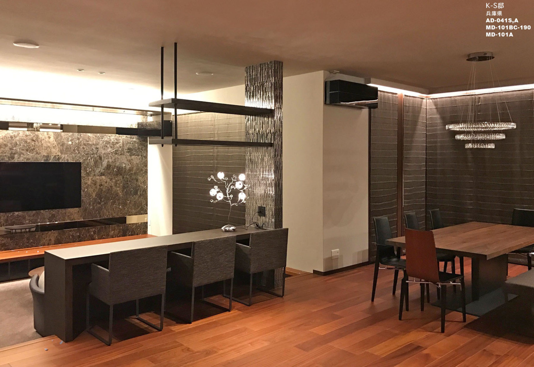内装のカラースキムを【サペリ×ウォルナット】でまとめた、重厚感の中に華やかさが溢れる上質な空間。その空間に、勇壮なマット調マテリアルをベースとし、煌びやかなマテリアルをアクセサリー感覚で添えていきました。素材、色、デザイン全てが引き立て合う【マニッシュ×ブリリアント】なモダンインテリアをご提案させて頂きました。